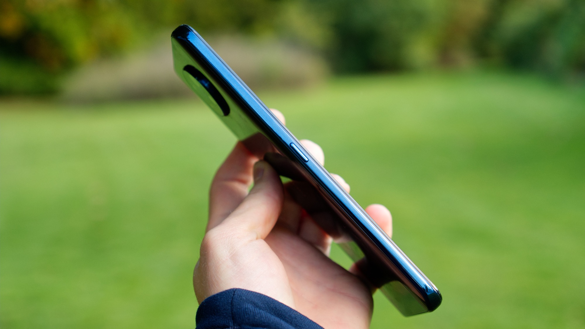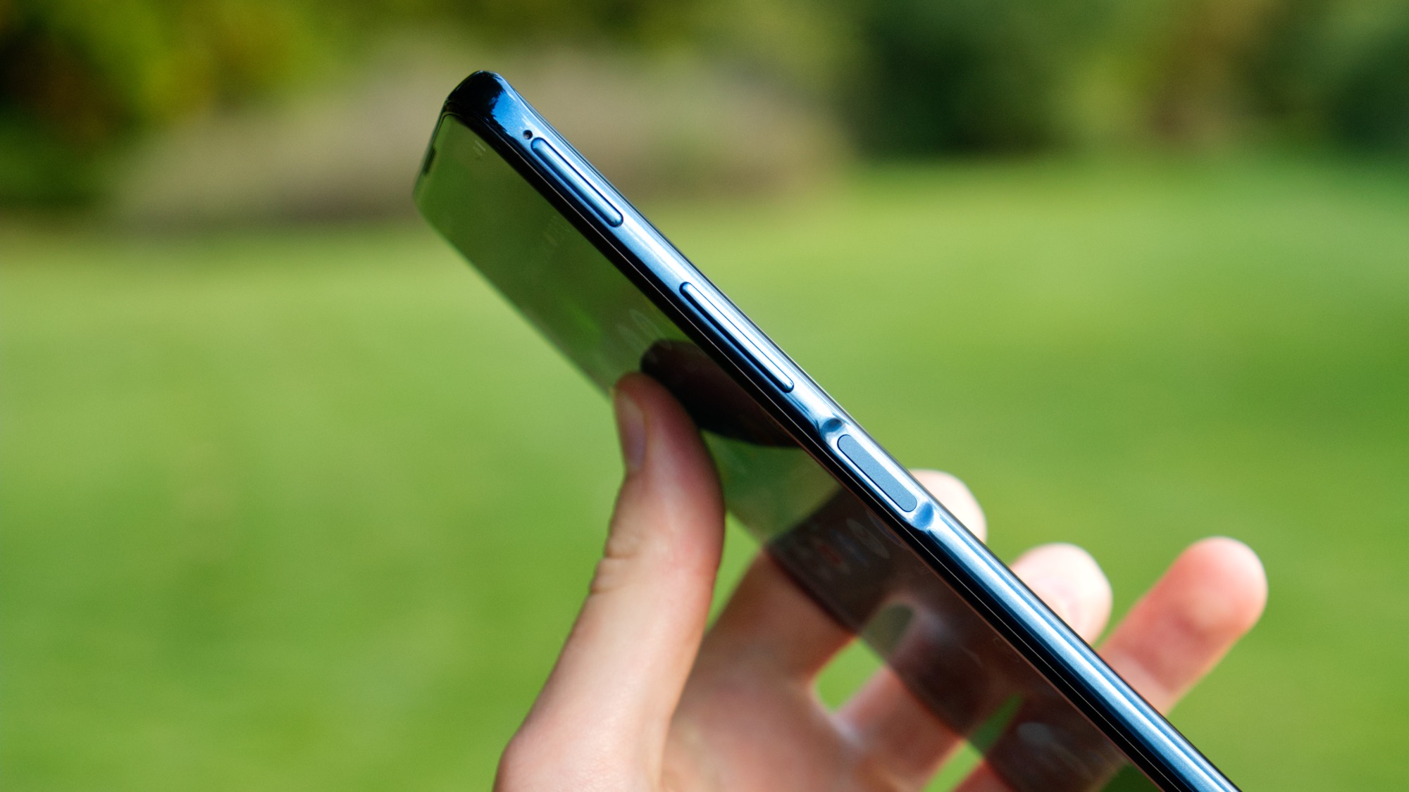 Även om vi är imponerade av den stabila och lyxiga känsla som Nokia 8.3 ger i handen, så saknar vi den typ av metallram som annars är vanlig. Nokia 8.3 väljer istället plast. Det betyder bland annat att det polerade utseendet för sidorna riskerar att repas. Längs höger sida finns i alla fall en fingeravtrycksläsare som också fungerar som på/av-knapp. Den fungerar pålitligt men är inte den snabbaste vi har testat. Det är inte ovanligt att det tar en knapp sekund för den att registrera ett fingeravtryck. Ovanför läsaren finns två volymknappar. De är dessvärre lite svampiga och gnisslar ofta när vi trycker in dem. Knappen på vänster sida är lite bättre. Den leder användare raka vägen till Google Assistent och fungerar bra för det. Den går dock att stänga av om så önskan. Den kan däremot inte omprogrammeras.