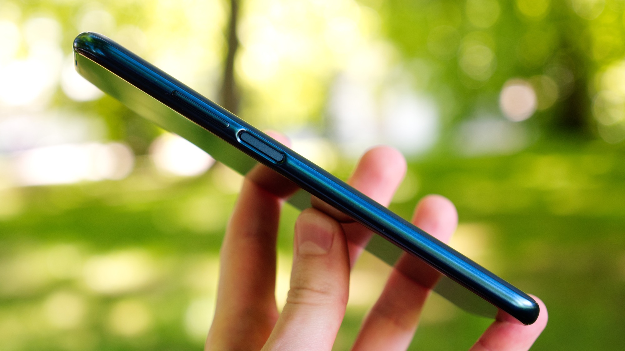 Längs vänster sida finns en på/av-knapp och volymknappar. På/av-knappen agerar också fingeravtrycksläsare. Den fungerar bra och pålitligt om vi är noggranna med att få en bra inläsning. Knapparna ger bra fysisk återkoppling och är enkla att använda. Längs ovansidan finns en sekundär mikrofon medan vänster sida bjuder på en knapp för Google Assistent och en kortläsare med plats för dubbla nanoSIM-kort eller ett nanoSIM- och ett microSD-kort. Assistent-knappen är praktisk men är också lätt att trycka av misstag, vilket aktiverar röststyrning även när telefonen är låst. Om knappen stör mer än den gör nytta går den att inaktivera i mjukvaran. Längs undersidan finns slutligen en mikrofon, högtalare, USB-C-port och en hörlursport.