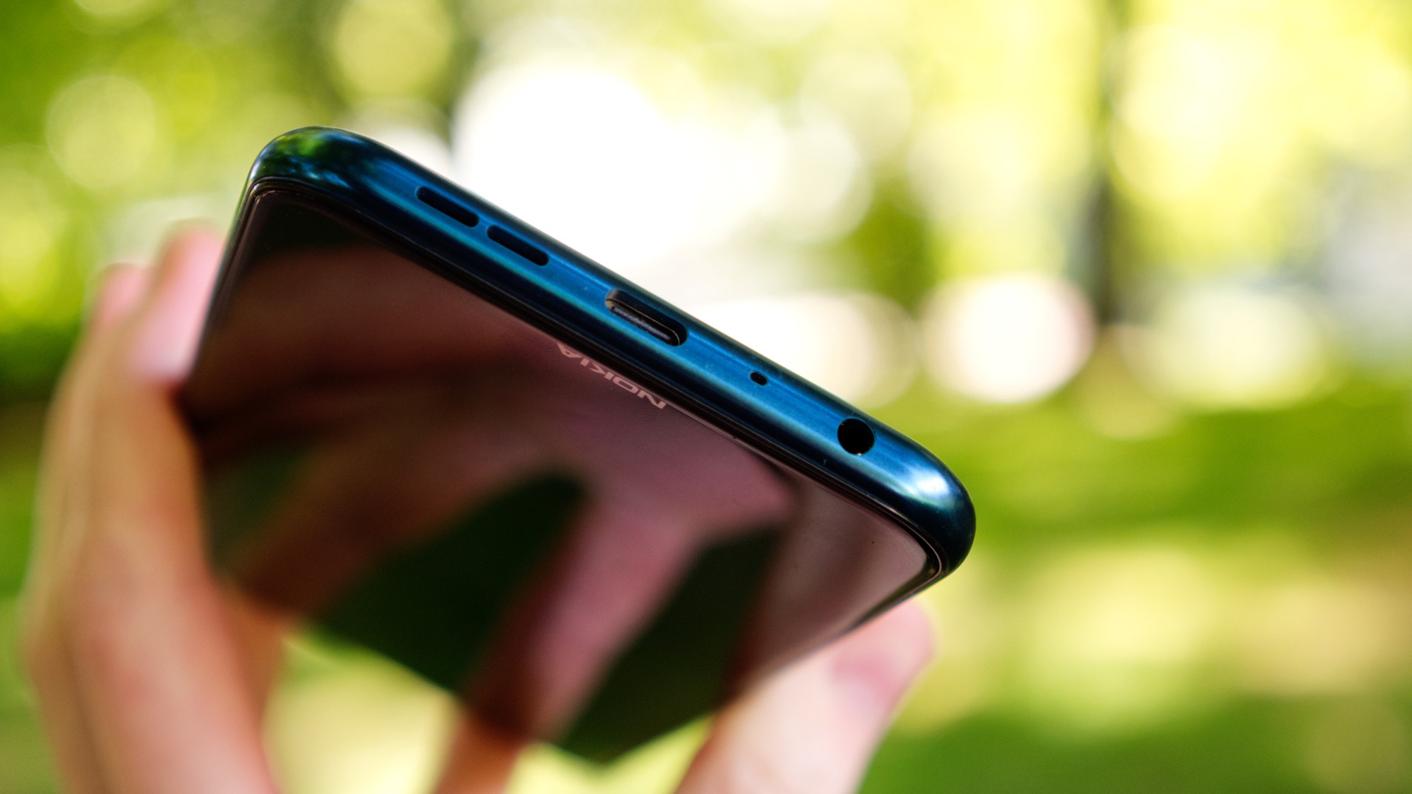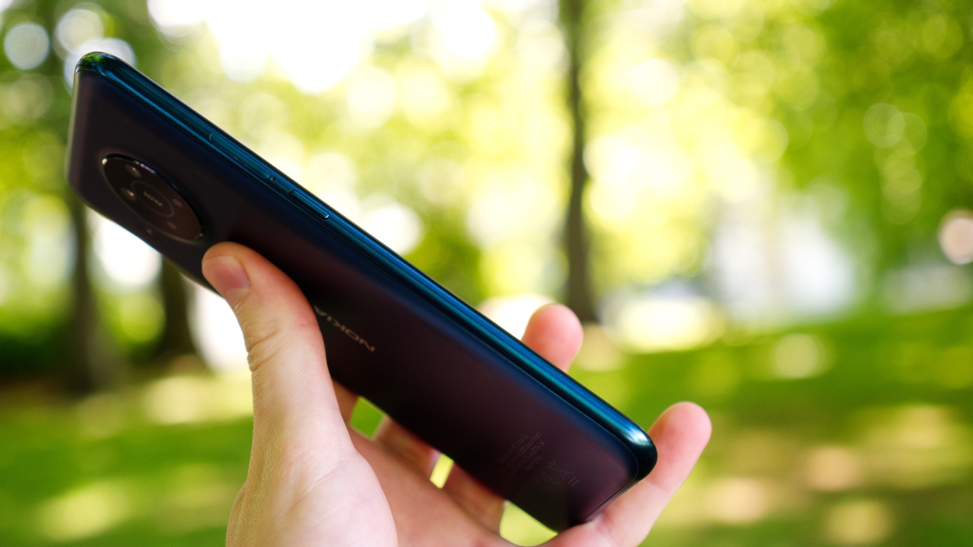 Sidorna är också gjorda av plast. Trots det är telefonen stadigt konstruerad. Vi hör inget gnissel eller knak i fogarna, hur mycket vi än vrider och vänder på den. Telefonen är dock stor och lite svår att hantera. Med en bredd på över 79 mm, är Nokia X20 den bredaste mobilen vi testat på flera år. Det gör den svår att greppa, även för personer med stora händer.