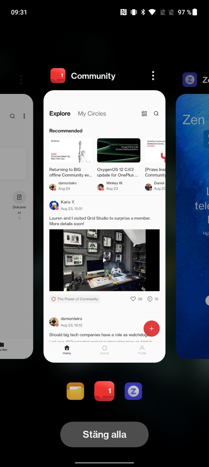 När vi testar OnePlus 10T, använder den Oxygen OS 12. Det är en mjukvara som snart ska ersättas av version 13. Eftersom den inte är relevant för många av er som läser detta testet, ska vi inte gå in på detalj. Vi kan ändå nämna att OnePlus mjukvara ofta hyllas för att den är snabb och enkel. Med åren har företaget lagt till allt fler funktioner. Shelf är till exempel namnet på en funktion som är aktiv som standard i OnePlus 10T och som ger tillgång till en dedikerad widgets-vy när vi sveper ner från höger sida av skärmens överkant. På en stor och avlång skärm tycker vi att det är ett väldigt dumt designval. Shelf går att stänga av men funktionen är ett exempel på att OnePlus historiskt enkla mjukvara inte nödvändigtvis är lika enkel längre.