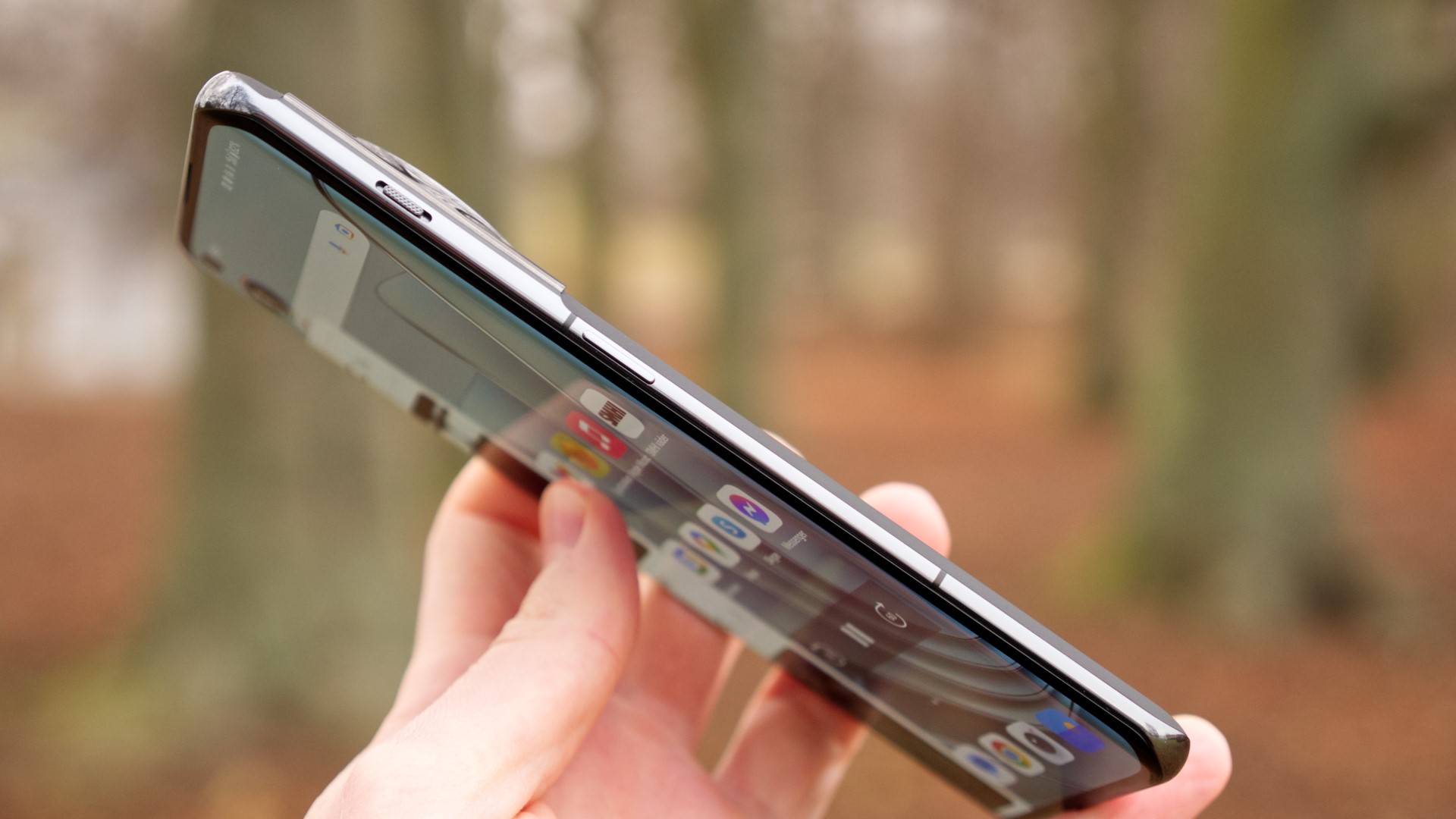 Framsidan av OnePlus 11 bjuder på en 6,7 tum skärm som har tunna skärmramar och en bra inbyggd fingeravtrycksläsare. Skärmen är rundad längs sidorna men det är en ganska försiktig böj. Skärmens rundning ger ett modernt utseende och gör telefonen smalare än den annars hade varit. Det gör den också sannolikt dyrare och svårare att reparera.