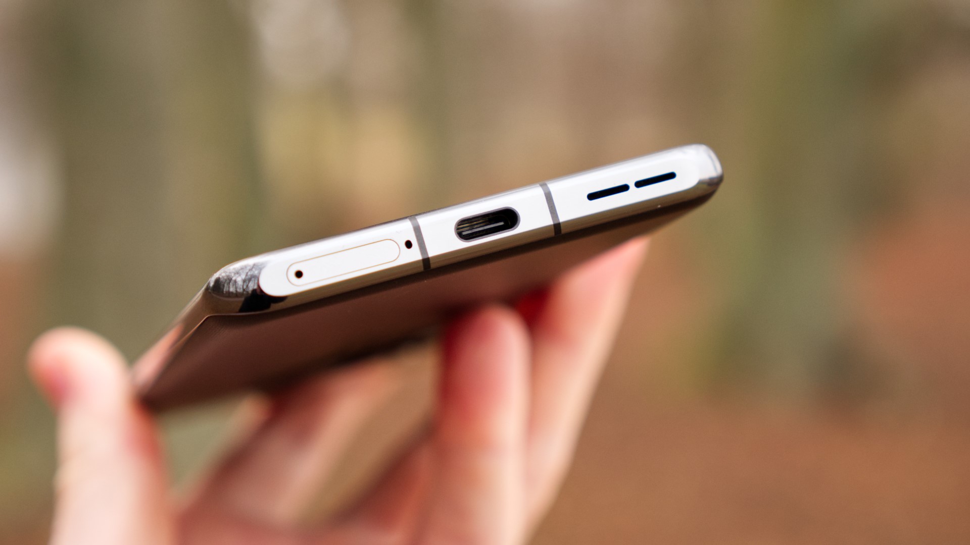 På undersidan finns plats för dubbla nanoSIM-kort (ja, det finns även stöd för eSIM), en mikrofon, en högtalare och en USB C-port. USB-porten har bara stöd för USB 2 så den är långsam när den kopplas till datorer och kan inte kopplas med kabel till en extern bildskärm. Det är helt uppenbart en kostnadsbesparing som OnePlus valt för att få ner priset under vad OnePlus 10 Pro lanserades för. Två andra besparingar är bristande skydd mot vatten samt avsaknad av stöd för trådlös laddning. Detta är två brister som sticker ut som särskilt problematiska för priset.