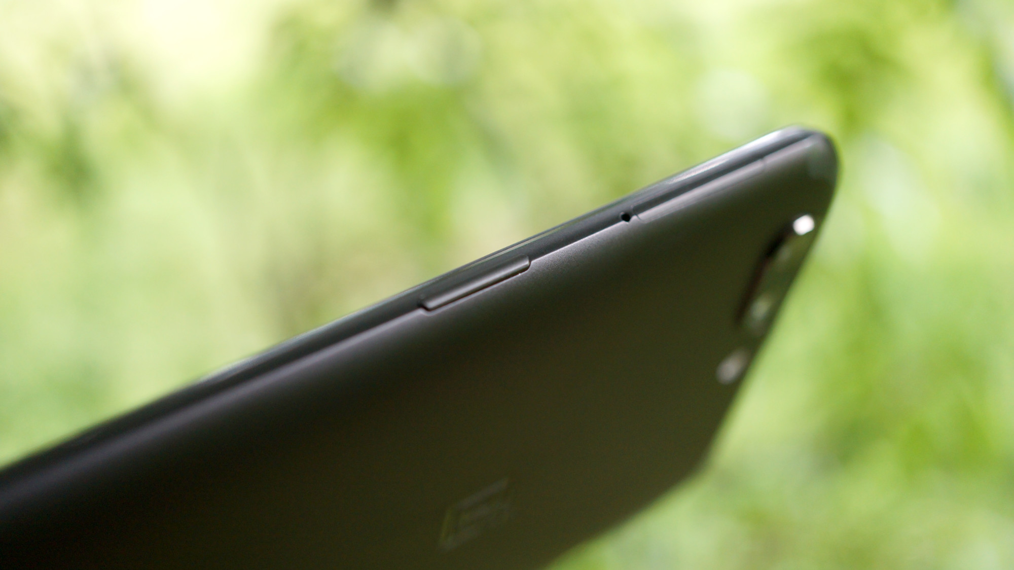 På höger sida sitter en på/av-knapp. Ovanför den finns en SIM-kortsläsare som har plats för dubbla SIM-kort. Här finns ingen plats för något microSD-kort. Användare får med andra ord nöja sig med telefonens interna lagringsutrymme. På vänster sida finns två volymknappar och ett unikt ljudreglage. Reglaget kan flyttas och placeras i tre lägen: Tyst, Stör inte och Ring. Reglaget påminner lite om Apples iPhone-reglage men OnePlus ger alltså användare fler alternativ.
