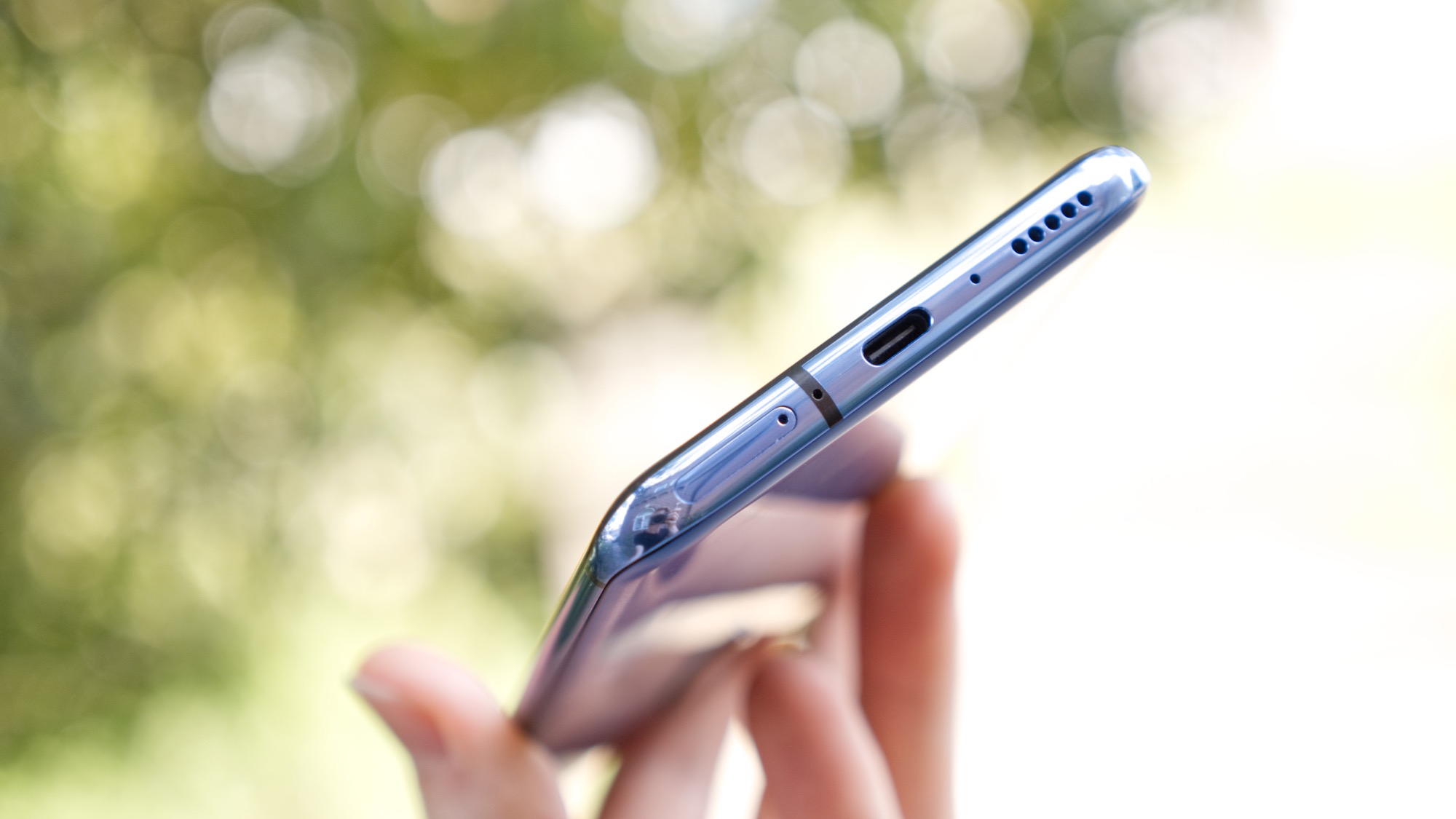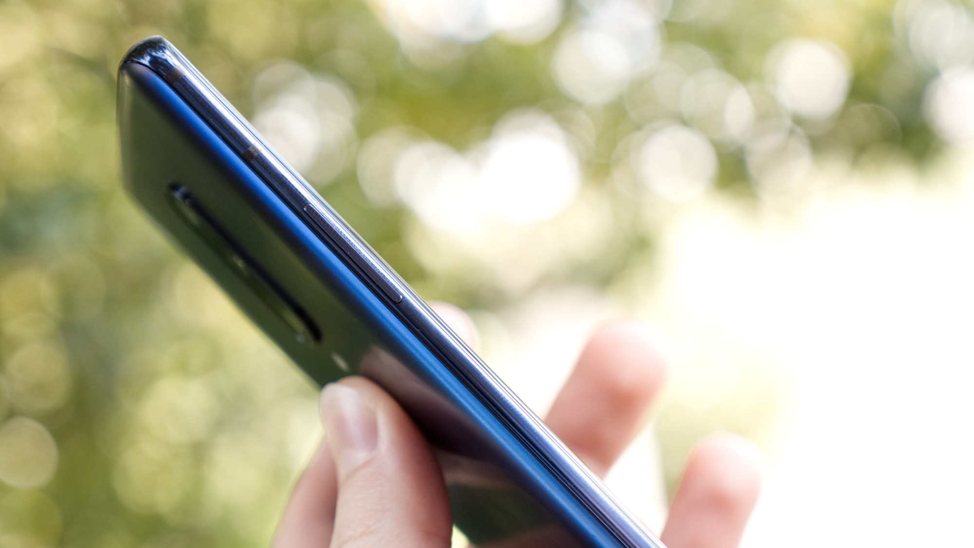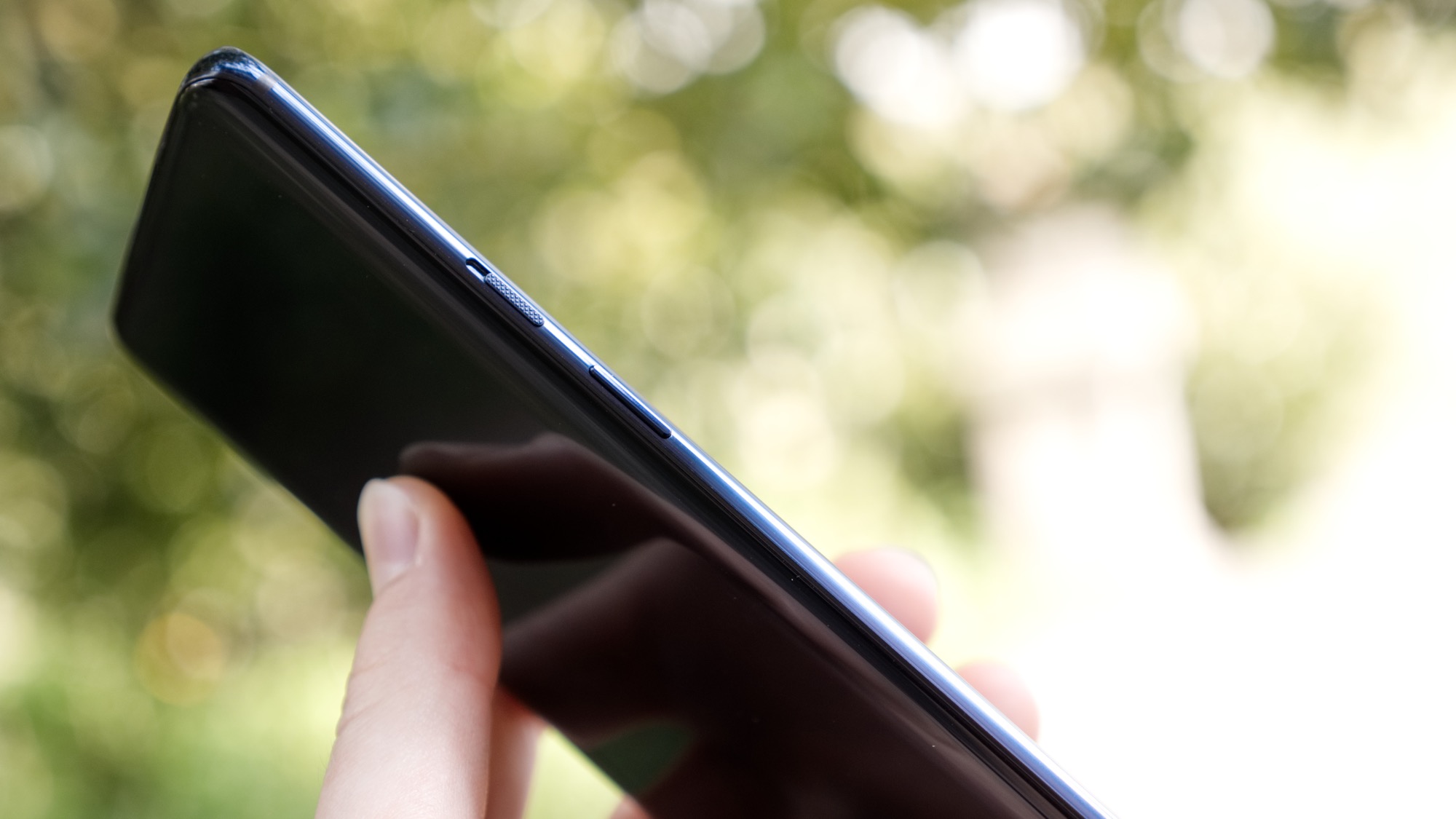 Den tonade färgen från bakstycket fortsätter längs sidorna av telefonen, där metallbandet följer samma toning som glasbakstycket. Längs höger sida finns en på/av-knapp och en brytare för att lägga telefonen i ett av tre ljudlägen. Vi älskar detta lilla fysiska reglage eftersom det passar särskilt bra till Googles senaste version av Android, där det har blivit svårare att snabbt justera ringvolym.