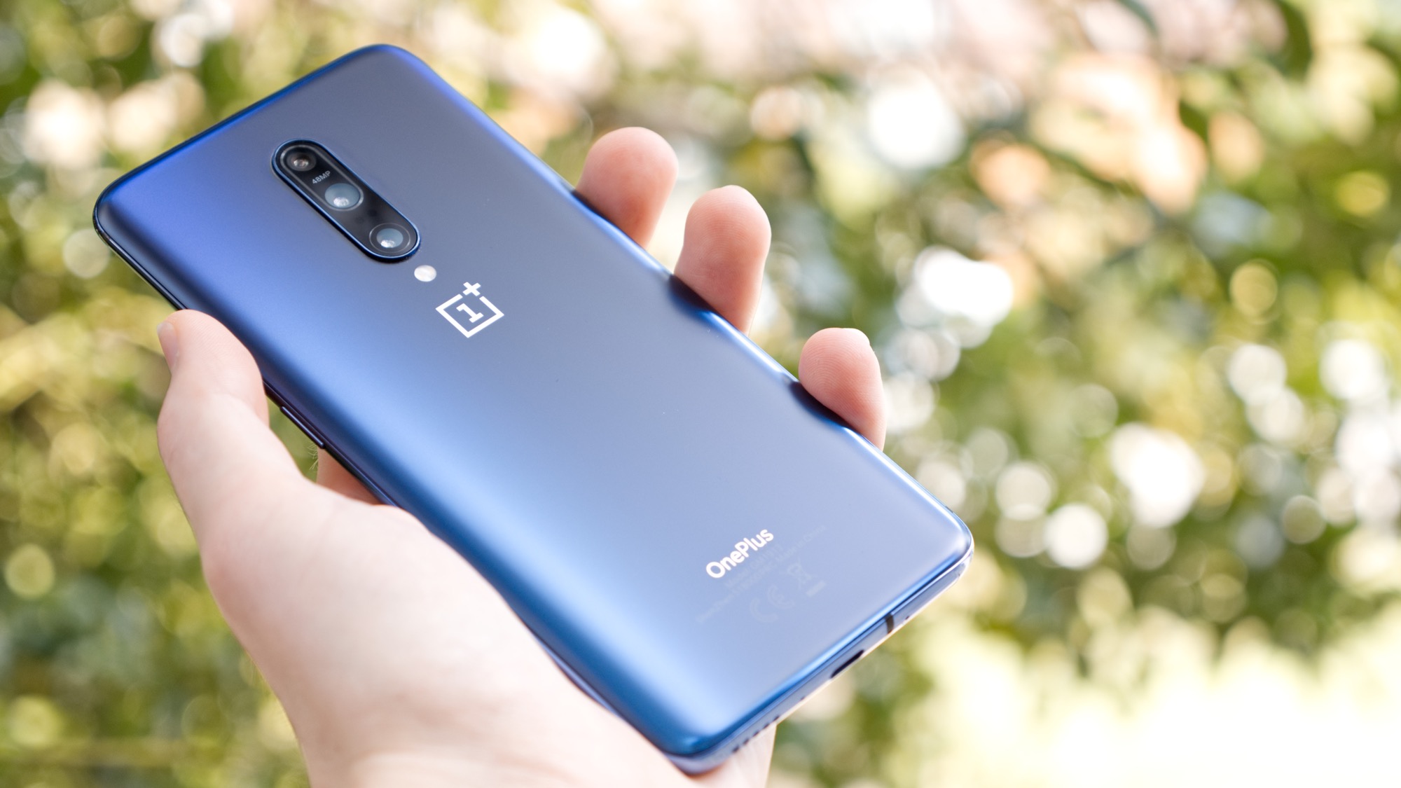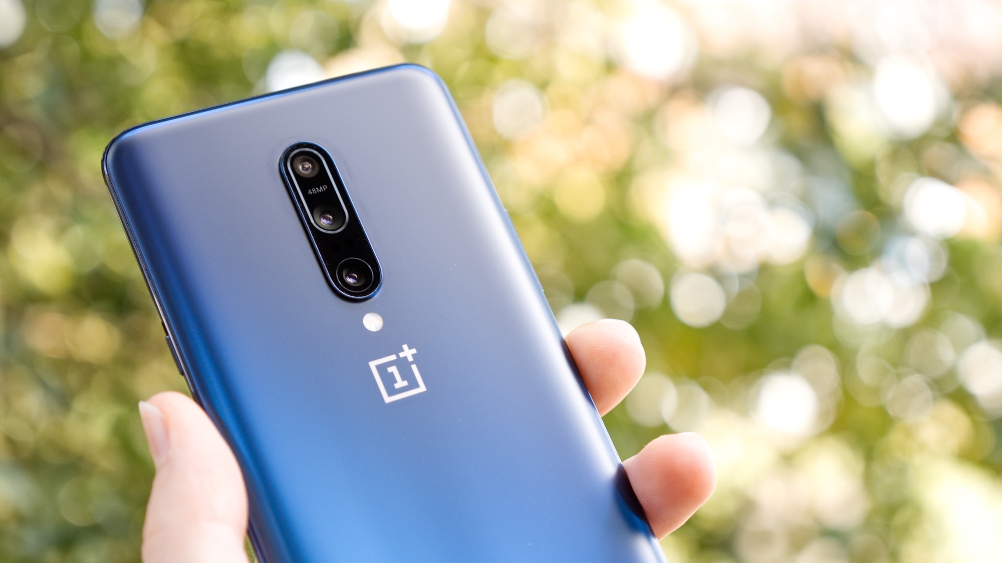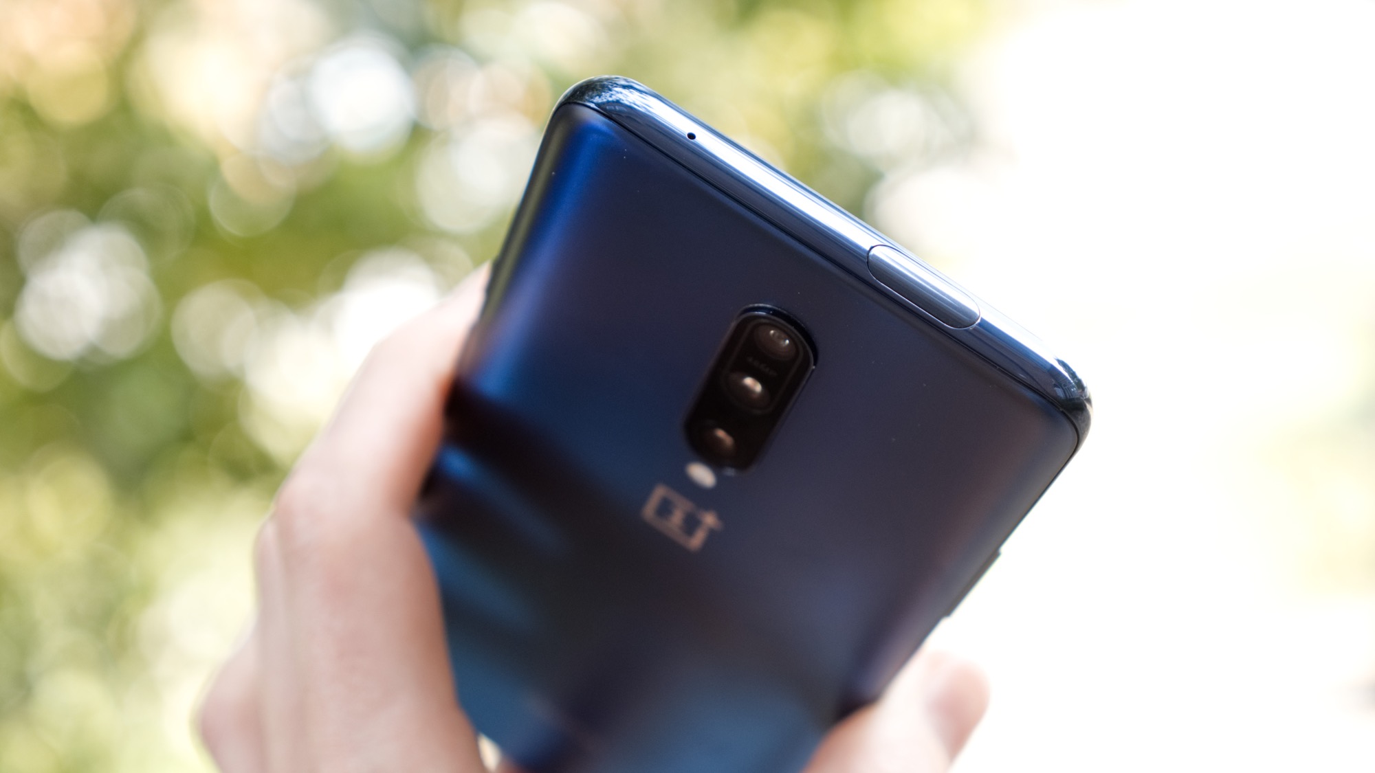 På baksidan finns en centrerad kameramodul med tre kameror som sticker ut cirka en centimeter. Under den finns två LED-lampor och en OnePlus-logga. På vårt blåa exemplar har glaset en lite matt finish och en toning från blått till mörkblått. Bakstycket reflekterar inte ljus riktigt som vanligt glas utan påminner nästan mer om metall i sitt utseende och sin känsla. Det ger OnePlus 7 Pro ett unikt utseende som definitivt får den att sticka ut på marknaden.
