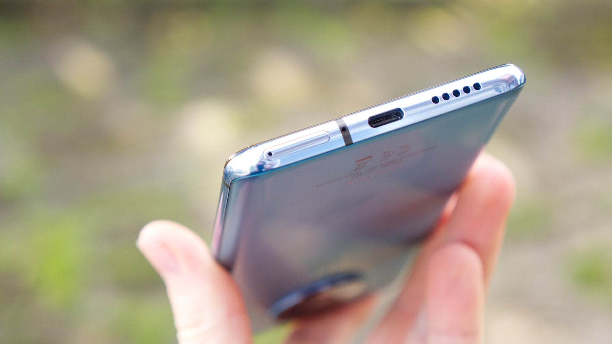 Runt telefonen finns en traditionsenlig aluminiumram med en blank finish. På undersidan finns en USB Typ C-port, en högtalare och en kortplats med plats för dubbla nanoSIM-kort. Här finns alltså fortfarande ingen hörlursport. OnePlus inkluderar inte heller någon hörlursadapter i lådan.