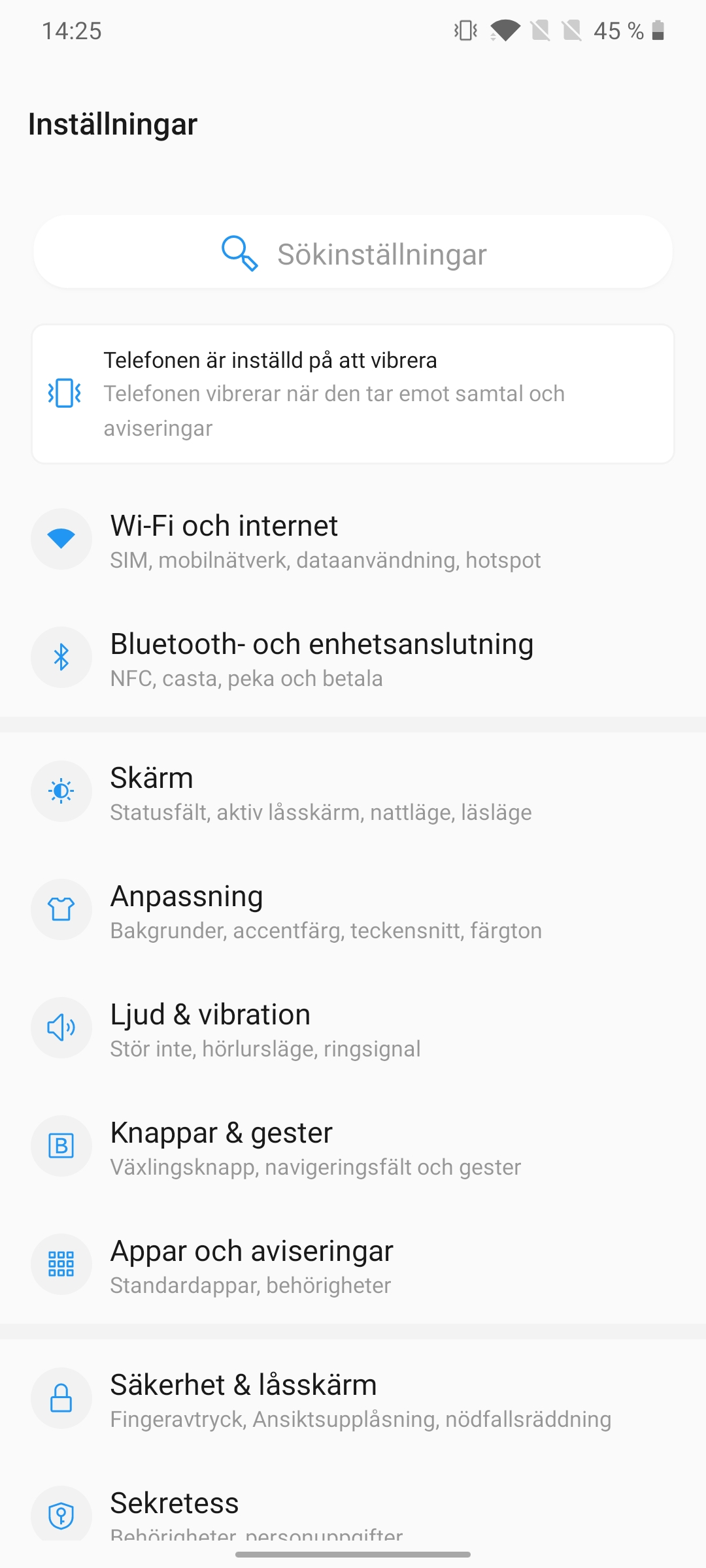 Läs mer om mjukvaranMed OxygenOS 10 får OnePlus 7T flera nyheter genom Android 10. Ett nytt system för behörigheter låter till exempel användare ta bättre kontroll över appars tillgång till platsinformation. Istället för att bara bestämma om en app har tillgång till GPS-data kan användare nu ge tillgång när appen används aktivt. En annan nyhet är Digitalt välmående. En ny funktion kallad Varva ner hjälper användare att göra telefonen mindre stressande vid slutet av dagen genom att sätta skärmen i gråskala och inaktivera Stör ej-läget enligt ett förbestämt schema. Detta är särskilt stora nyheter för OnePlus, eftersom de inte valde att inkludera Android-funktionen Digitalt välmående i OxygenOS 9.