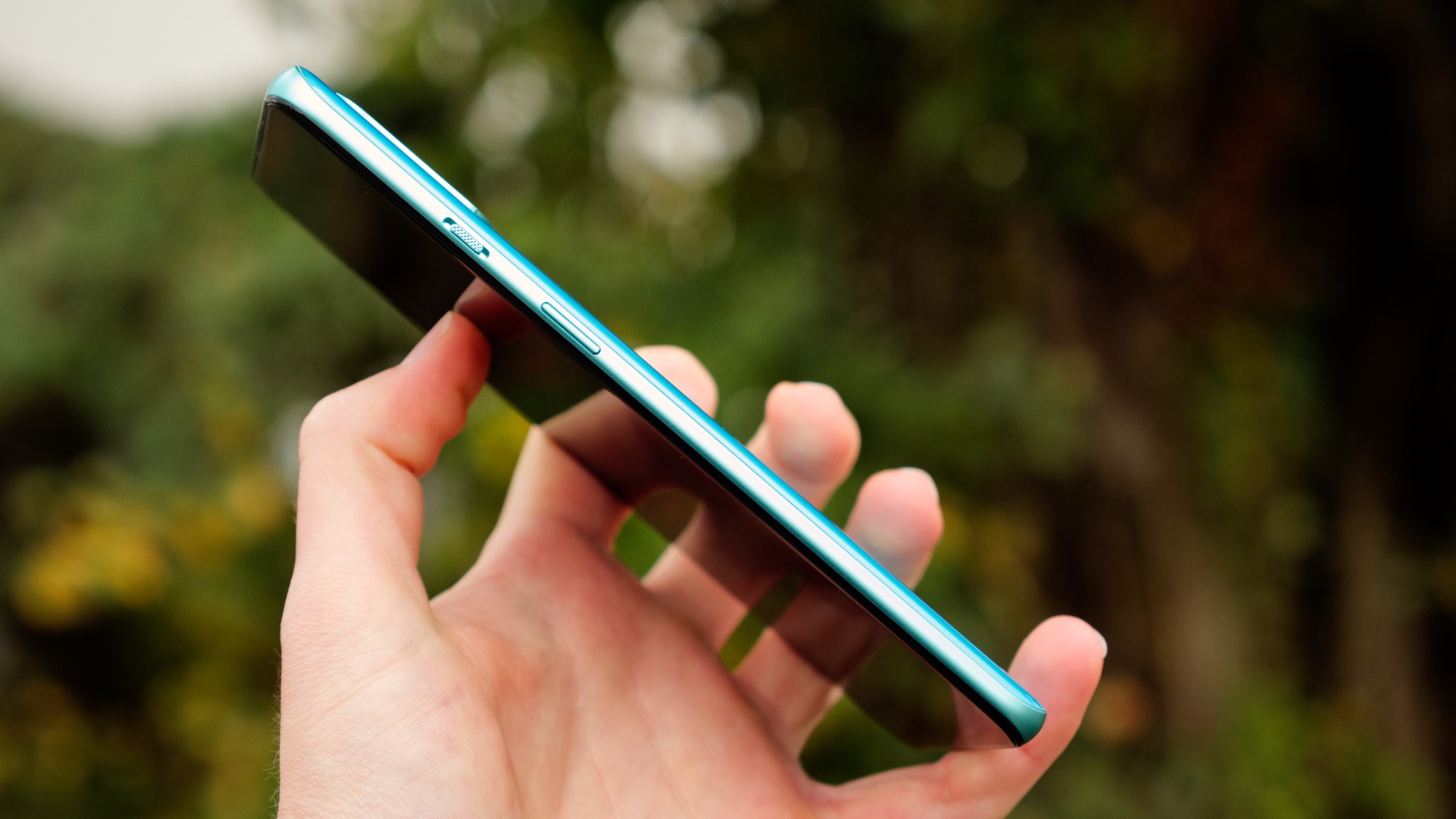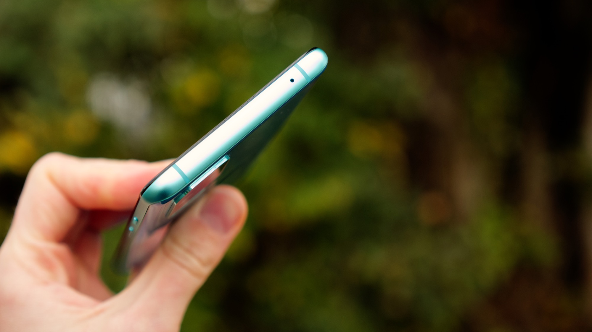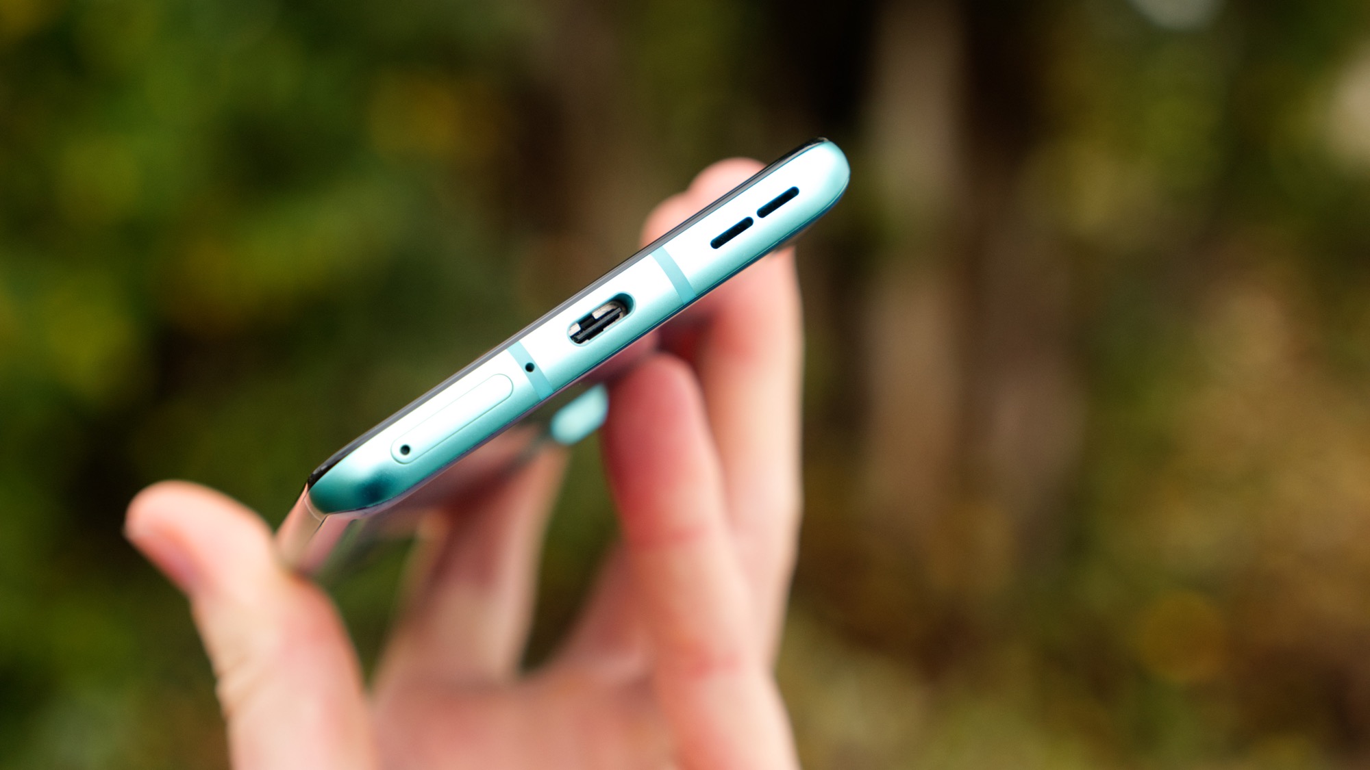 Höger sida har en på/av-knapp samt OnePlus unika reglage för att sätta telefonens ljudläge. Reglaget har tre lägen: ljudlöst, vibration och ljud på. På ovansidan finns en sekundär mikrofon och på vänster sida finns volymknappar. Knapparna ger bra fysisk återkoppling och är lätta att använda. Längs undersidan finns en mikrofon, högtalare, USB Typ C-port och en kortläsare. Läsaren har plats för dubbla nanoSIM-kort men inget microSD-kort.