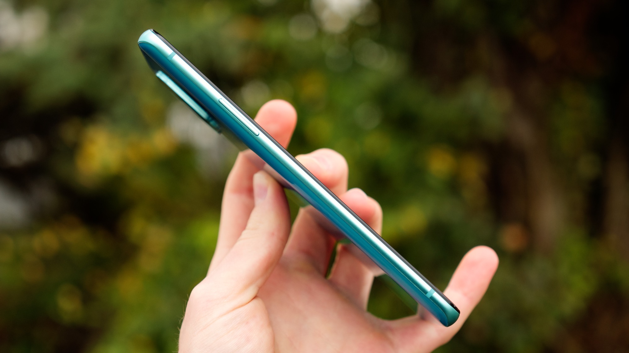 OnePlus val av material har inte förändrats mellan modellerna. Baksidan täcks av glas och sidorna av aluminium. Telefonen säljs inte med ett inkluderat skal men det kan köpas separat. Likt syskonet bjuder för övrigt inte baksidan på något stöd för trådlös laddning, det lämnas åt företagets flaggskepp: OnePlus 8 Pro.