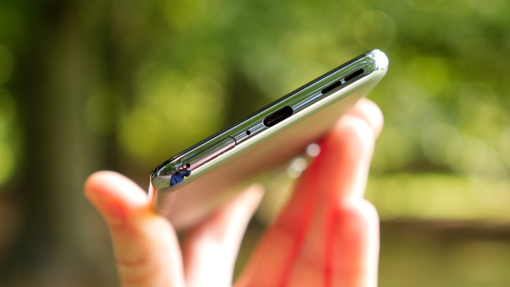 Sidorna är inte riktigt lika påkostade som baksidan. OnePlus har valt plast, ett helt rimligt val för klassen. Plasten har en blank finish som påminner om polerad metall. Längs höger sida finns en på/av-knapp och ett ljudreglage. Ljudreglaget fortsätter att vara en OnePlus-unik funktion i Android-världen, som vi verkligen uppskattar! På/av-knappen är rimligt placerad och ger tillräcklig feedback för att vara enkel att använda. Det samma gäller volymknapparna på vänster sida. Längs ovansidan finns en sekundär mikrofon medan undersidan bjuder på en till mikrofon, en USB-port, en högtalare och en kortplats. Kortplatsen har stöd för dubbla nanoSIM-kort. Det finns ingen plats för microSD-kort och telefonen saknar stöd för eSIM.