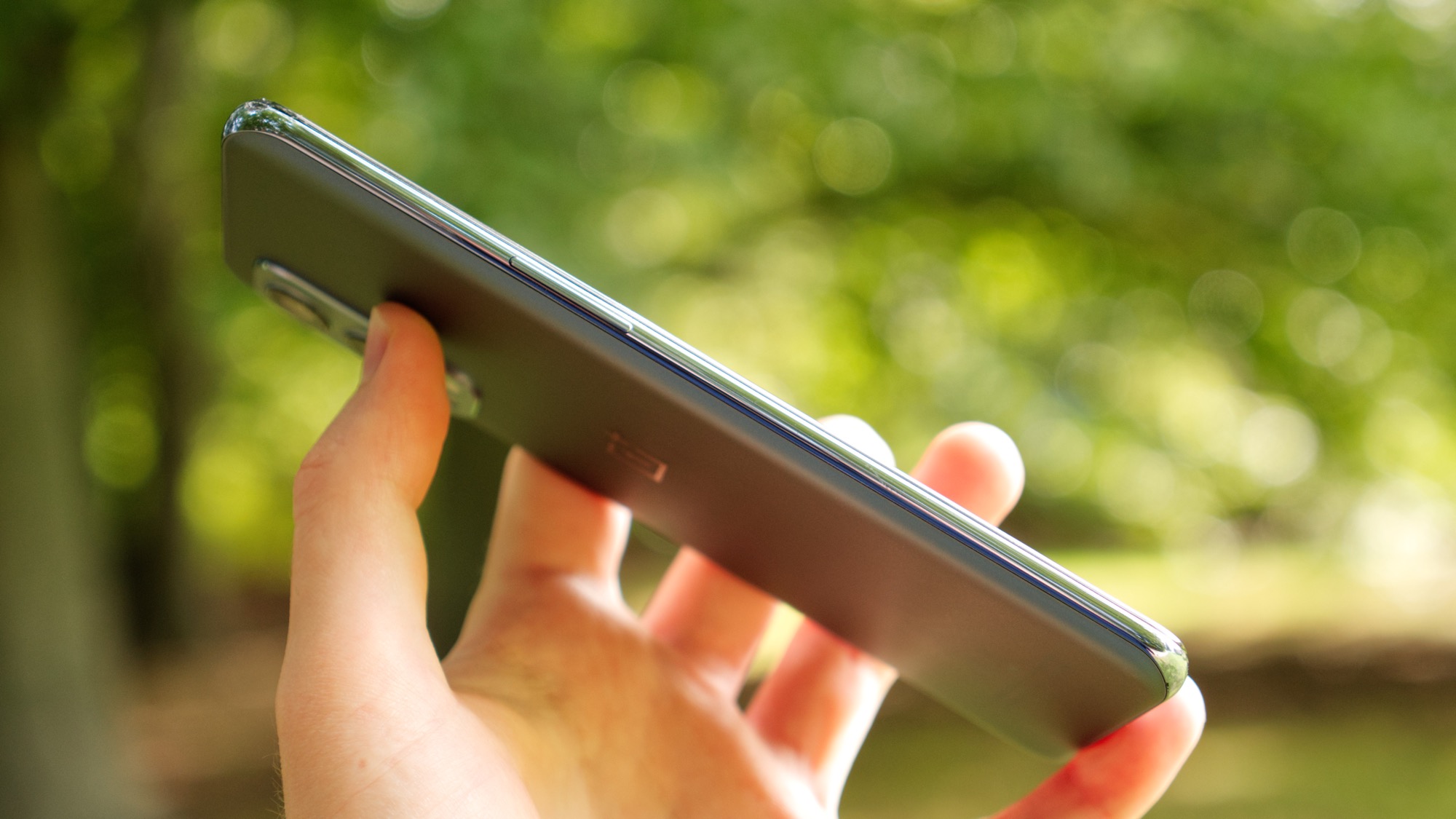 Baksidan på OnePlus Nord 2 är gjord av glas. Det gör den skör men ger också en kvalitetskänsla som börjar bli ovanlig i klassen. Allt fler konkurrenter väljer plast framför glas för att spara pengar. Vårt exemplar har en matt finish som är grå med en lätt blå ton. Vi gillar texturen men den kan vara hal för många, särskilt personer med torra händer. Det är då tacksamt att OnePlus inkluderar ett enkelt skal i lådan.