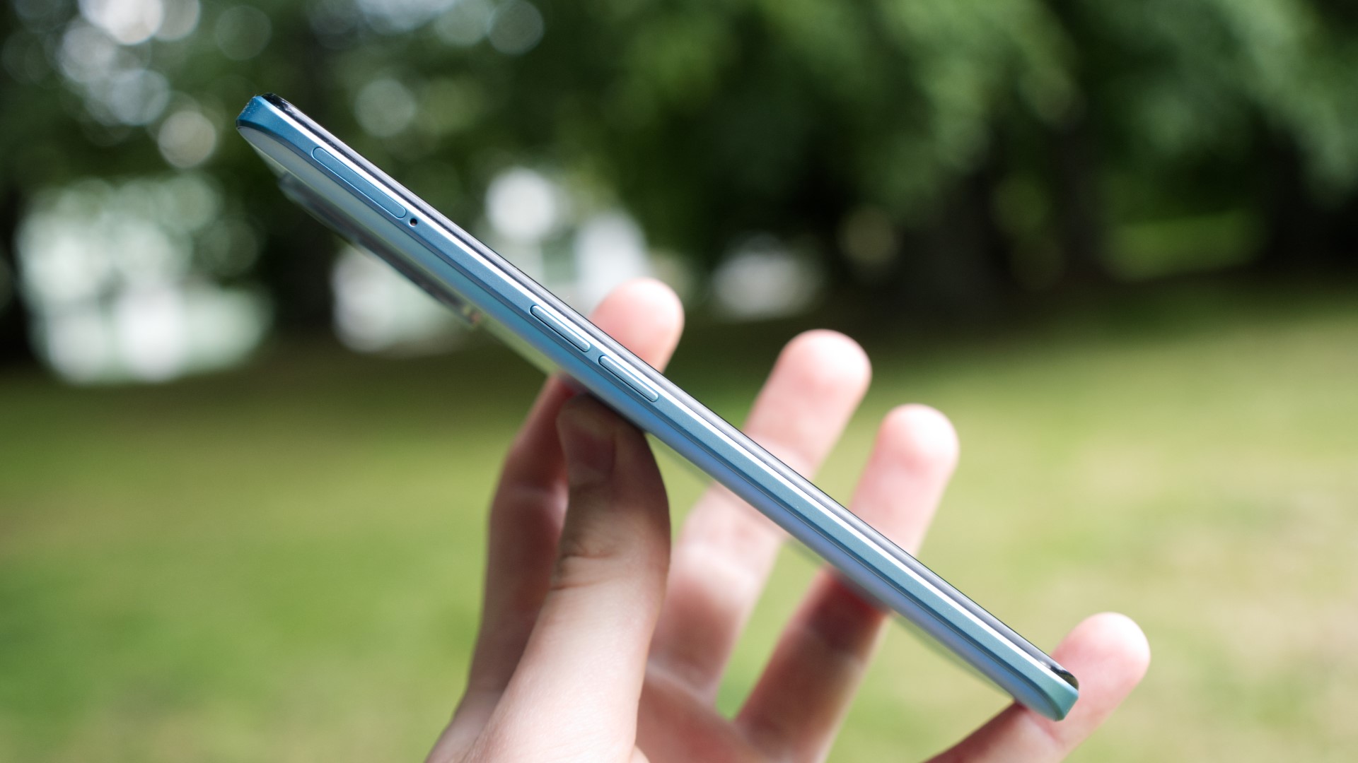 Sidorna är också gjorda av plast. Det märks i handen men vi hör inget knak eller gnissel från konstruktionen. På höger sida finns en på/av-knapp som också fungerar som fingeravtrycksläsaren. Den är tillräckligt pålitlig och snabb men kräver en bra inläsning för att fungera som den ska. På vänster sida finns två volymknappar men telefonen saknar ljudlägesreglage, som annars är vanligt på OnePlus-mobiler. I övrigt passar designen in väl i klassen. Nord CE 2 Lite är till exempel en av OnePlus sista mobil som har kvar hörlursporten. Den är dessutom en av få mobiler från företaget som har en microSD-kortläsare. Vi älskar den flexibilitet som det ger användare. Det finns för övrigt två dubbla nanoSIM-platser, varav en delas med microSD-kortet men det finns inte stöd för eSIM.
