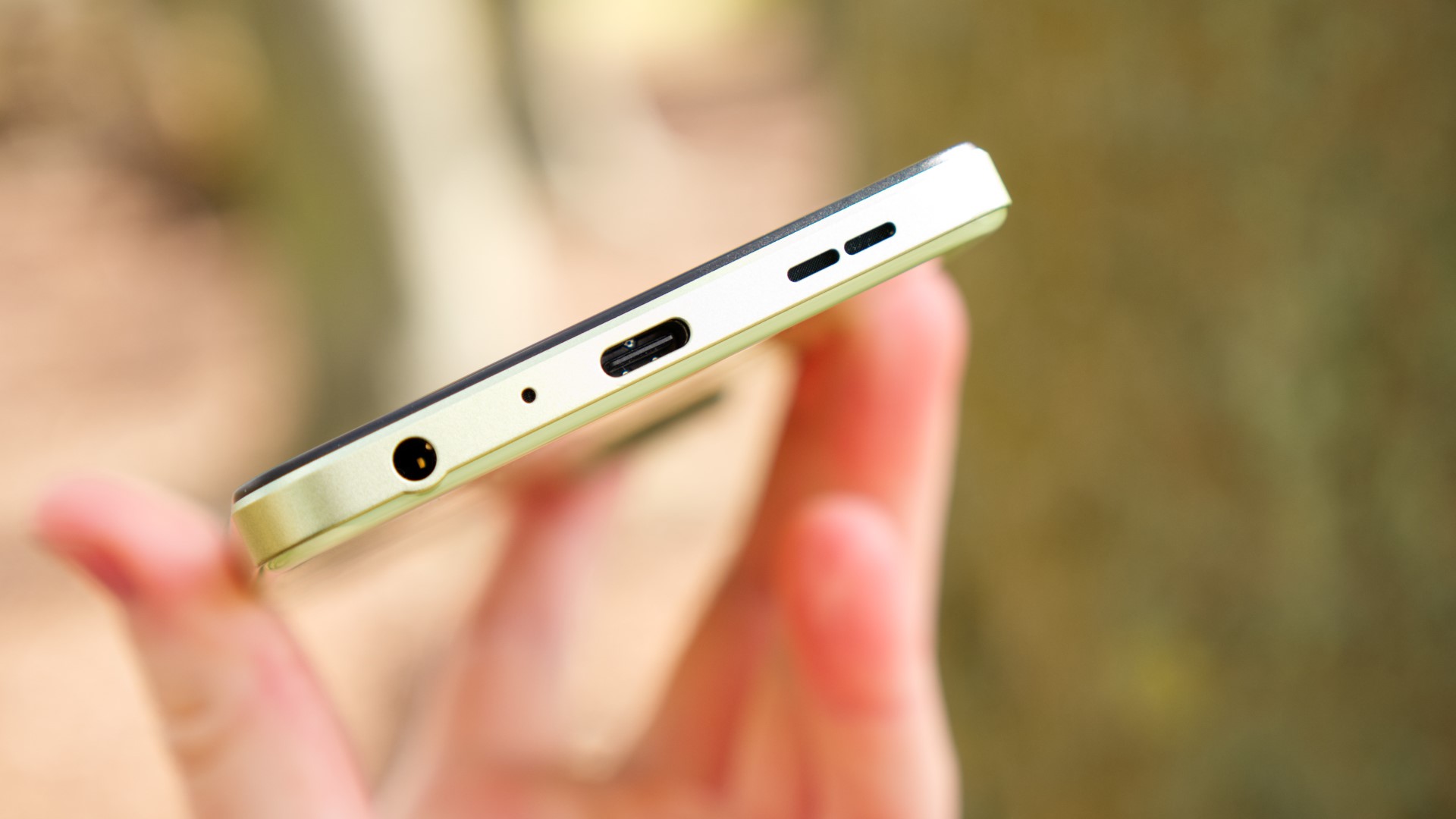 Längs undersidan finns en USB 2.0-port som saknar stöd för OTG (On-The-Go). Det betyder att till exempel USB-anslutna säkerhetsnycklar, USB-minnen eller tangentbord inte är kompatibla med telefonen. Här finns också en mikrofon, en högtalare och en hörlursport. Hörlursporten är en välkommen funktion men vi är allra mest glada av att se den längs undersidan. Många konkurrenter placerar hörlursporten på ovansidan, vilket gör att vi har kablar hängande från varje sida av telefonen när vi också laddar.