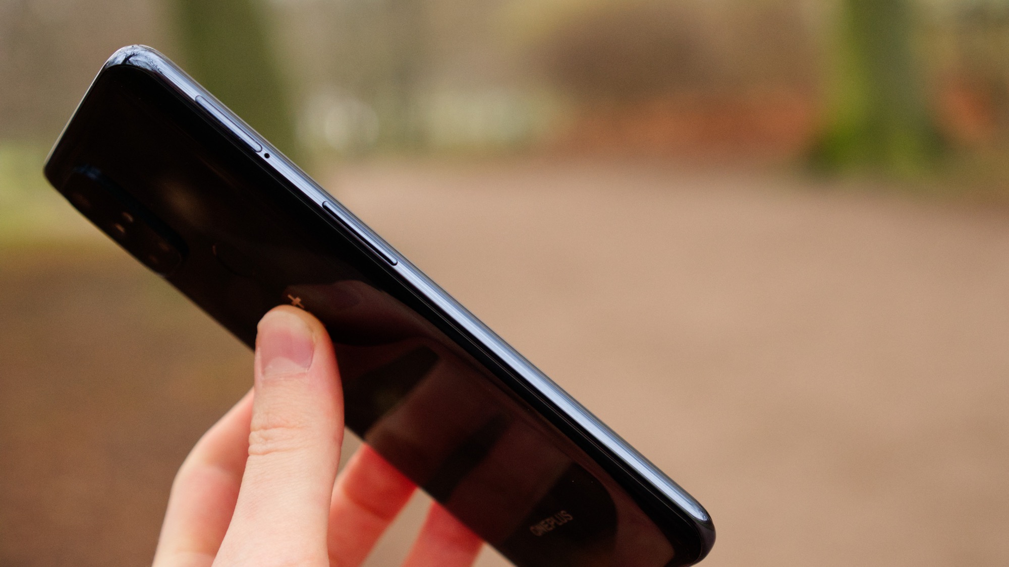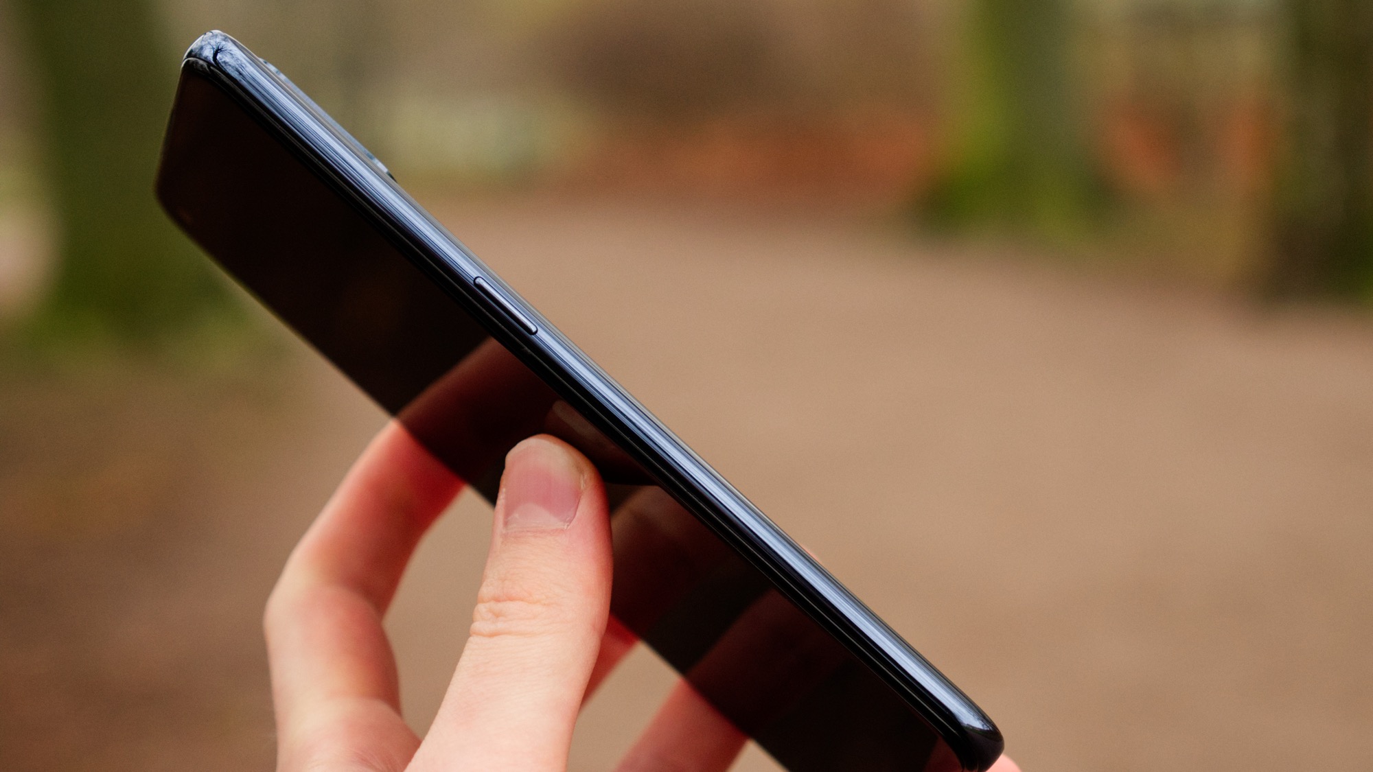 Sidorna av OnePlus Nord N10 är rundade för att ligga bekvämt i handen. Plasten har en glansig finish. Trots att sidorna är gjorda av plast vill vi påpeka att Nord N10 är väl konstruerad. Den knakar inte i fogarna, även om den knappast känns lyxigt konstruerad i handen. Längs höger sida finns i alla fall en på/av-knapp. På motsatt sida finns volymkontroller men inget ljudreglage. Ljudreglaget är annars en exklusiv funktion i varumärkets mobiler som alltså saknas helt i N10. Ovanför volymknapparna finns en kortläsare med plats för dubbla nanoSIM-kort eller ett nanoSIM- och ett microSD-kort. Detta bryter också varumärkets traditioner. Företaget har aldrig haft microSD-kortläsare i sina mobiler. Det är inte svårt att dra slutsatsen att N10 är designad av ett annat utvecklingslag än normalt. OnePlus DNA saknas. När det gäller microSD-kortläsaren är det å andra sidan inget annat än positivt.