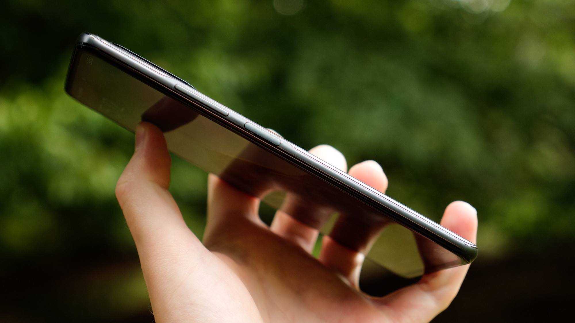 Baksidan möter plast längs sidorna. Plasten känns stadig och knakar eller gnisslar aldrig. Även om metall ofta ger en bättre känsla av kvalitet, har Poco gjort ett bra jobb med denna plastdesignen. Längs höger sida finns en fingeravtrycksläsare som är snabb och pålitlig, åtminstone om vi är noggranna när vi registrerar vårt fingeravtryck. Läsaren fungerar också som på/av-knapp och sticker ut tillräckligt för att vara enkel att känna sig fram till. Volymknapparna sitter strax ovanför och ger bra fysisk återkoppling.