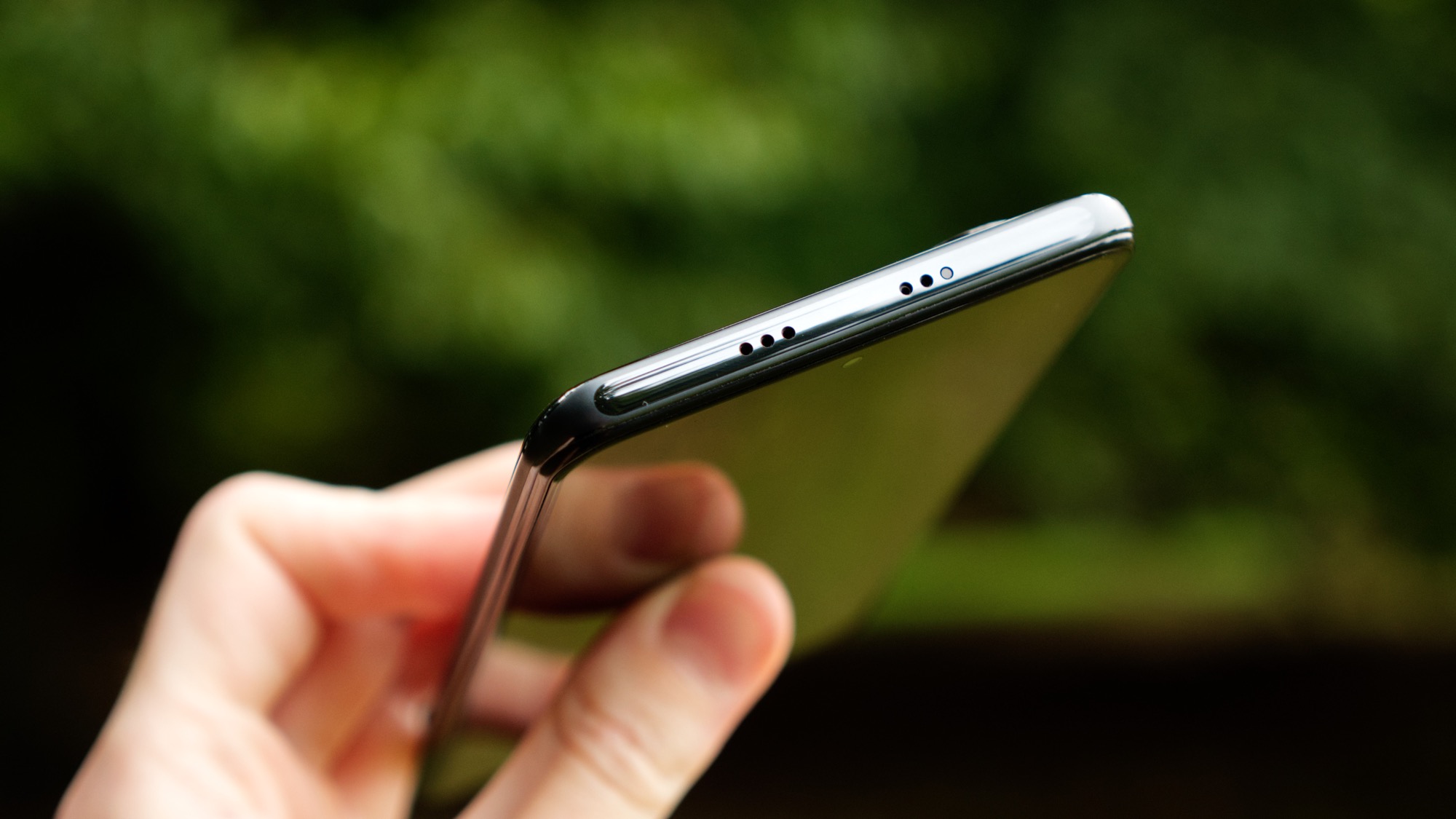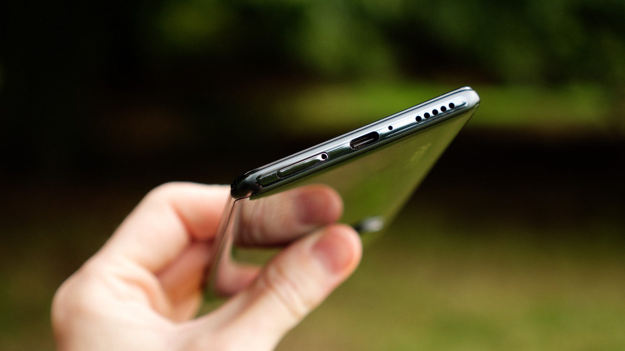 Längs ovansidan finns en IR-sändare som kan användas för att styra till exempel TV-apparater och stereoanläggningar. Här finns även högtalargaller som i själva verket är galler för en sekundär mikrofon men ingen högtalare. Poco F3 har lånat designdetaljer från Mi 11-serien, som har en högtalare på ovansidan, men inte inkluderat någon faktisk högtalare på ovansidan. Det är ett närmast skrattretande konstigt designval. Längs undersidan finns en faktisk högtalare under ett högtalargaller. Här finns också en USB C-port, en mikrofon och en kortläsare med plats för dubbla SIM-kort men inget microSD-kort.