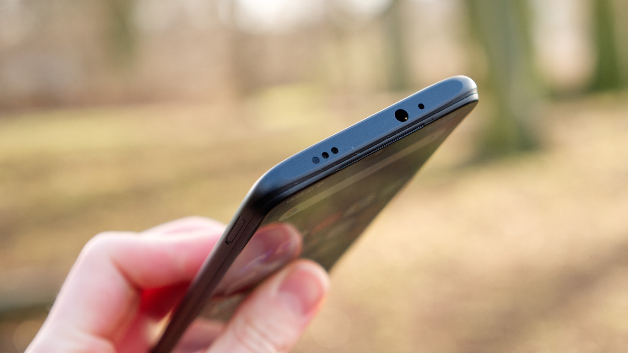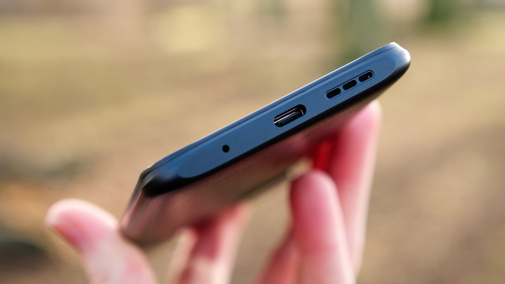 Längs vänster sida finns en kortläsare med plats för dubbla nanoSIM-kort och ett microSD-kort. Den dedikerade microSD-kortläsaren är generös, särskilt med tanke på telefonens redan generösa interna lagring. Längs undersidan hittar vi en USB C-port, en mikrofon och en högtalare.