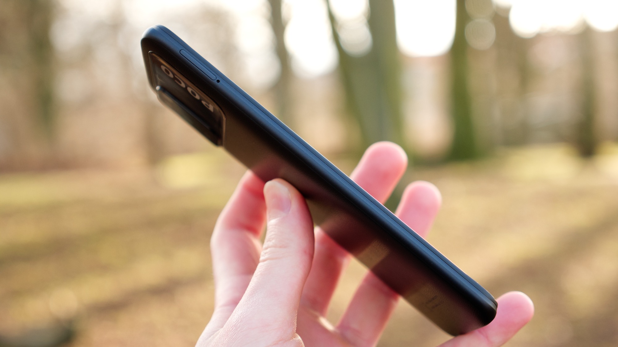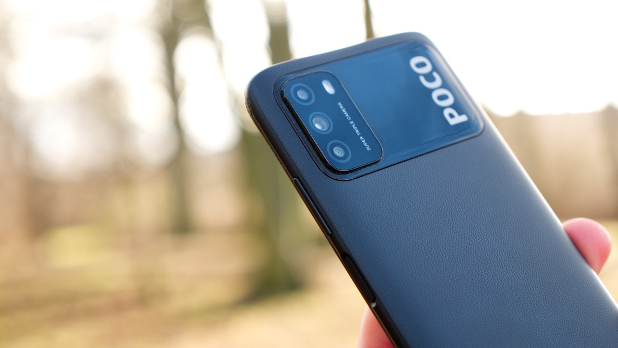 Stora delar av baksidan är gjord av plast, som gör ett ganska misslyckat försök att påminna om läder. Det är väldigt hårt. Det känns verkligen som plast, inte alls som läder. Bakstycket ger i alla fall ett intryck av att vara något annat än den tråkigt blanka plastbaksida som vi blivit vana vid i de lägsta prisklasserna. Vi kan uppskatta Pocos försök att även ge den billiga M3-modellen en unik design och personlighet. Med det sagt sticker den svarta färgen knappast ut ur mängden. För dig som tycker att svart är tråkigt finns en blå och en gul version med samma materialval i övrigt.