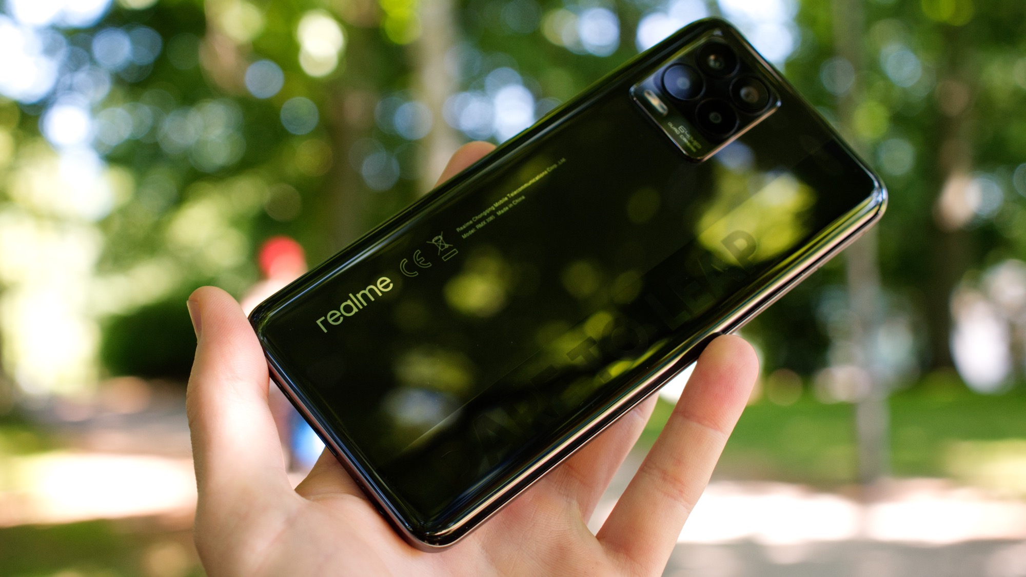 Ovan- och undersidan har en konkav form som gör att telefonen kan ställas på sin kortsida och att telefonen har ett lite mer industriellt utseende än flera konkurrenter. Framsidan har dock inget av det industriella design-DNAt. Här möts vi istället av en vanlig smartphoneskärm med ett kamerahål i det övre vänstra hörnet. Skärmen har kraftigt rundade hörn och en väl tilltagen ram längs underkanten. Den ser ut som vilken annan mellanklassmobil som helst. Ovanför skärmen finns en hörlur och flera sensorer men ingen notislampa. Notiser och klockan kan dock visas på en alltid på-skärm som Realme kallar ”Väntelägesskärm”.