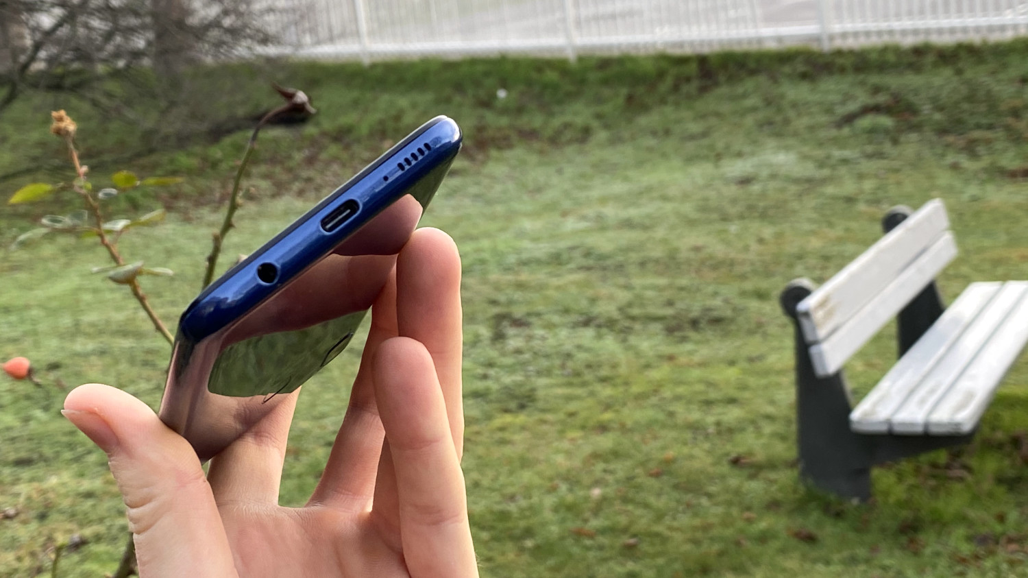 Bakstycket sträcker sig vidare över kanterna, helt utan skarvar. Längs höger sida finns en på/av-knapp och två volymknappar som ger bra fysisk återkoppling. På ovansidan finns en sekundär mikrofon och längs vänster sida finns en kortläsare med plats för dubbla SIM- och ett miroSD-kort. Utrymmet för totalt tre kort är ovanligt men nödvändigt i en mobil som Galaxy A20e. Längs undersidan finns slutligen en högtalare, mikrofon, USB Typ C-port och en hörlursport.