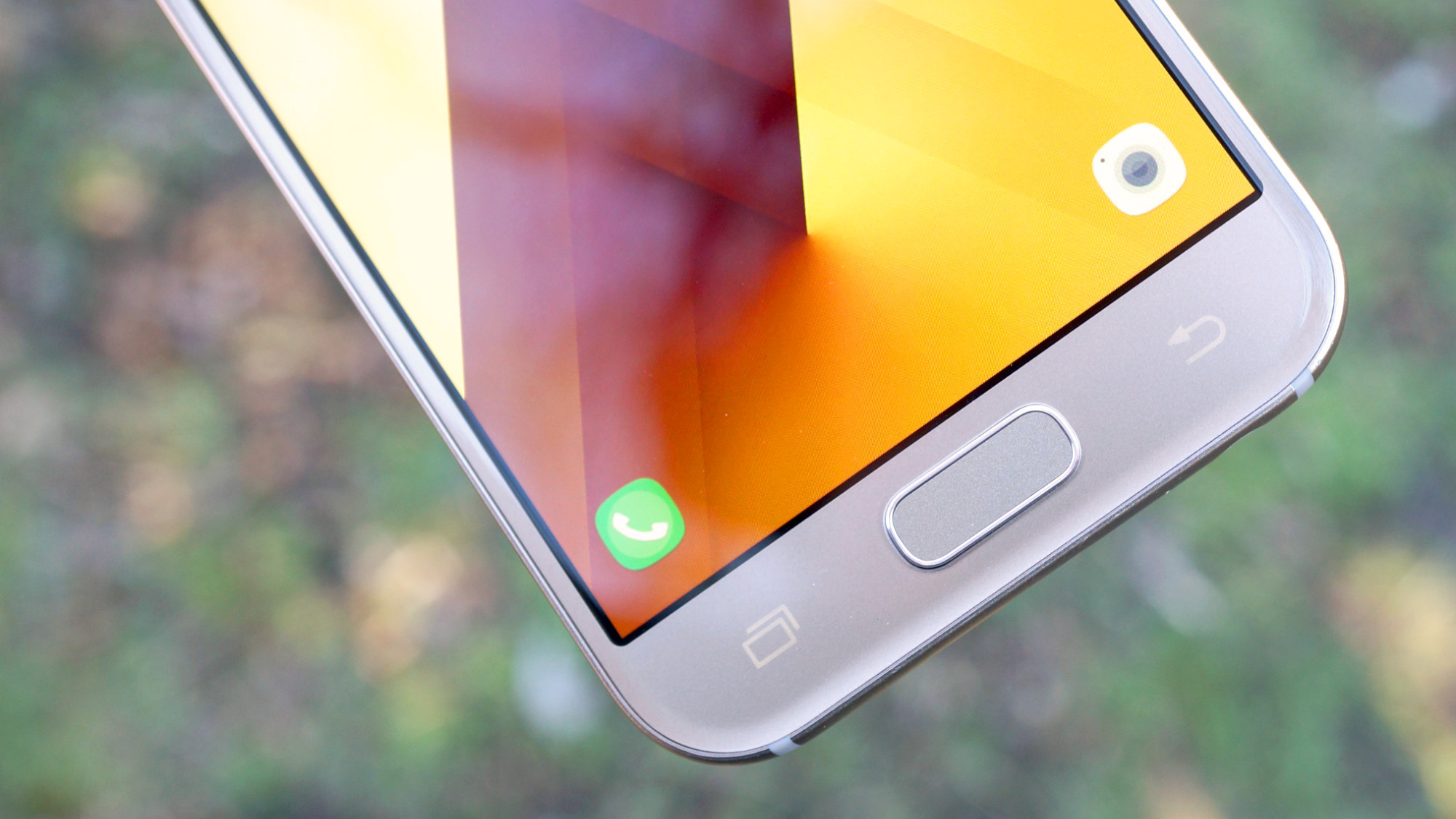 På framsidan av Galaxy A3 (2017) sitter en 4,7 tum skärm. Under skärmen sitter en fysisk hemknapp som inkluderar en fingeravtrycksläsare. Fingeravtrycksläsaren är en av de största nyheterna med Samsung Galaxy A3 (2017). Läsaren är inte snabb men är ändå en stor bonus då den gör det betydligt lättare för användare att ha en säker telefon som är enkel att använda.