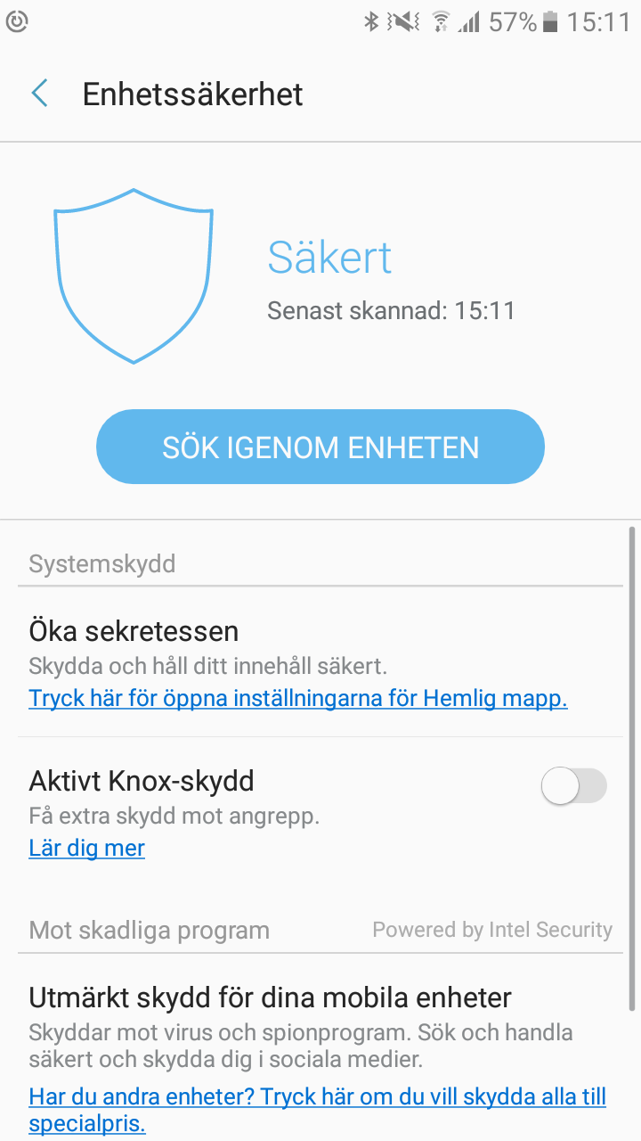 Samsung Galaxy A3 (2017) är också den första telefonen från Samsung, med undantag från Galaxy Note 7, som kommer med ett antivirus förinstallerat i telefonen. Samsung har gömt funktionen bland telefonens inställningar, så den stör inte användare, men vi ifrågasätter ändå behovet av ett antivirus-program som söker igenom appar när detta redan görs av Google.