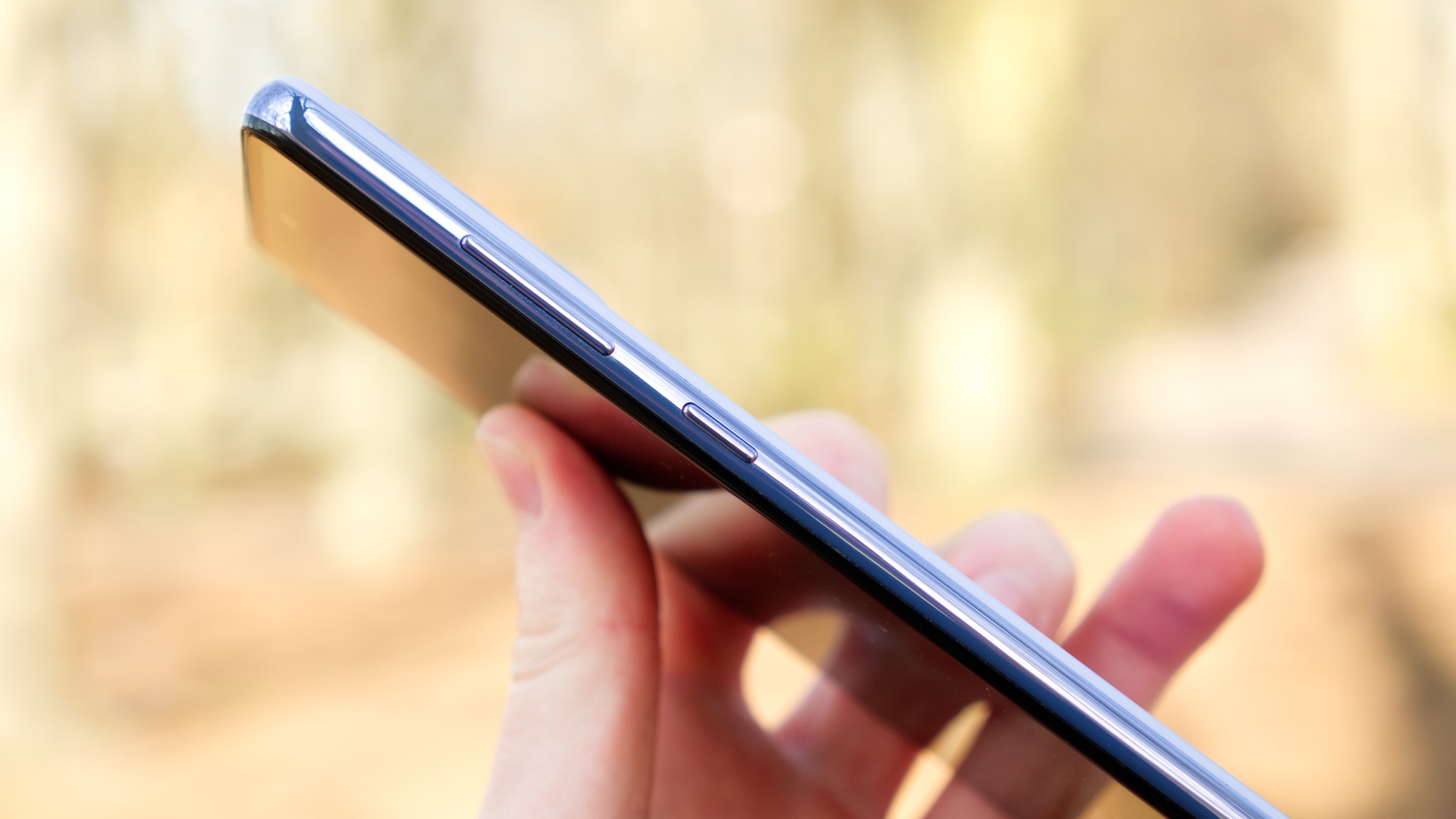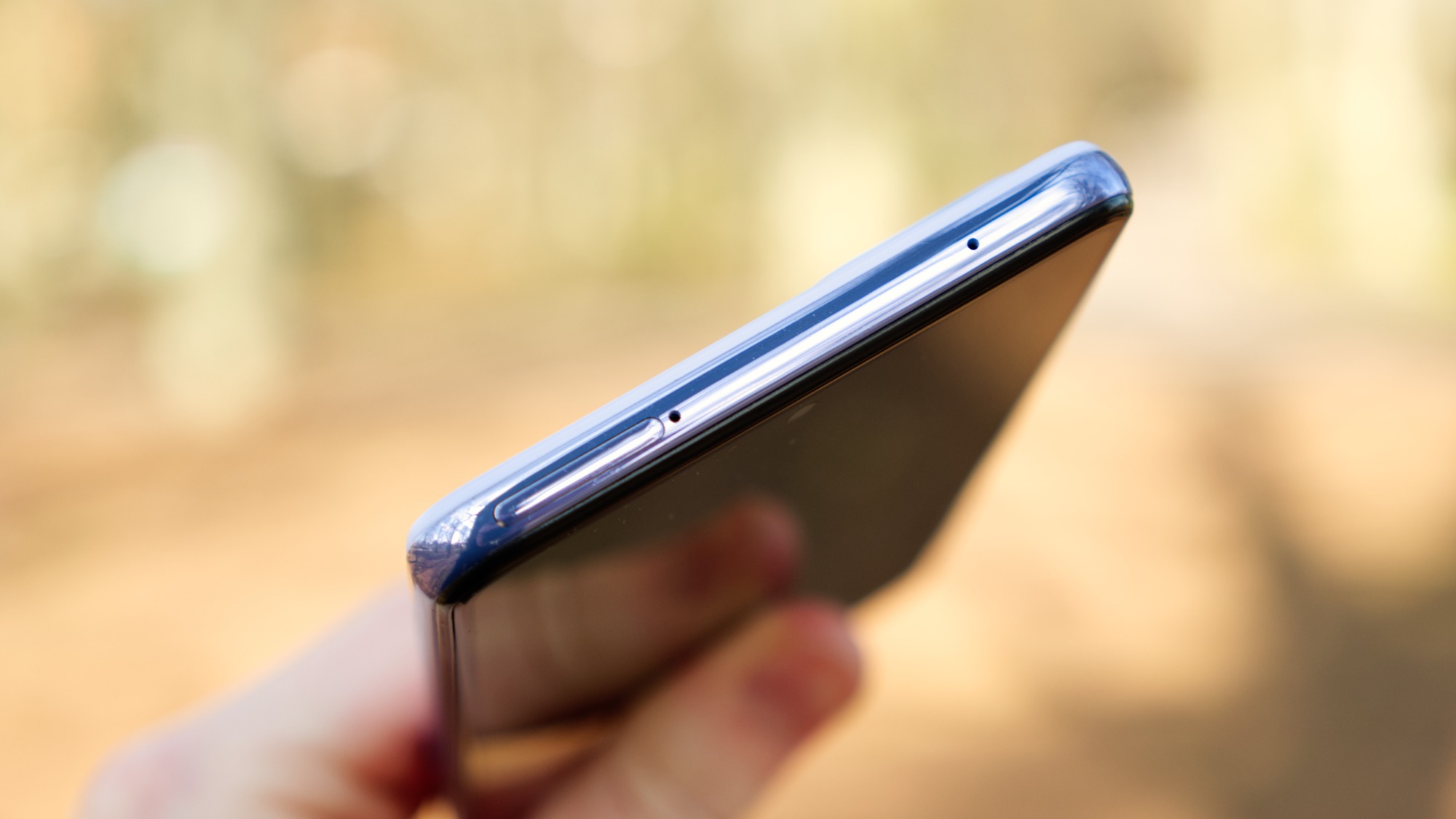 Längs sidorna har Samsung också valt plast. En glansig finish ger dock plasten ett metall-liknande utseende. Längs höger sida finns en på/av-knaopp och volymknappar. De är praktiskt placerade och ger bra fysisk återkoppling. Längs ovansidan finns en kortläsare med plats för dubbla nanoSIM-kort eller ett nanoSIM- och ett microSD-kort. Det finns för övrigt inget stöd för eSIM i Galaxy A52 5G.