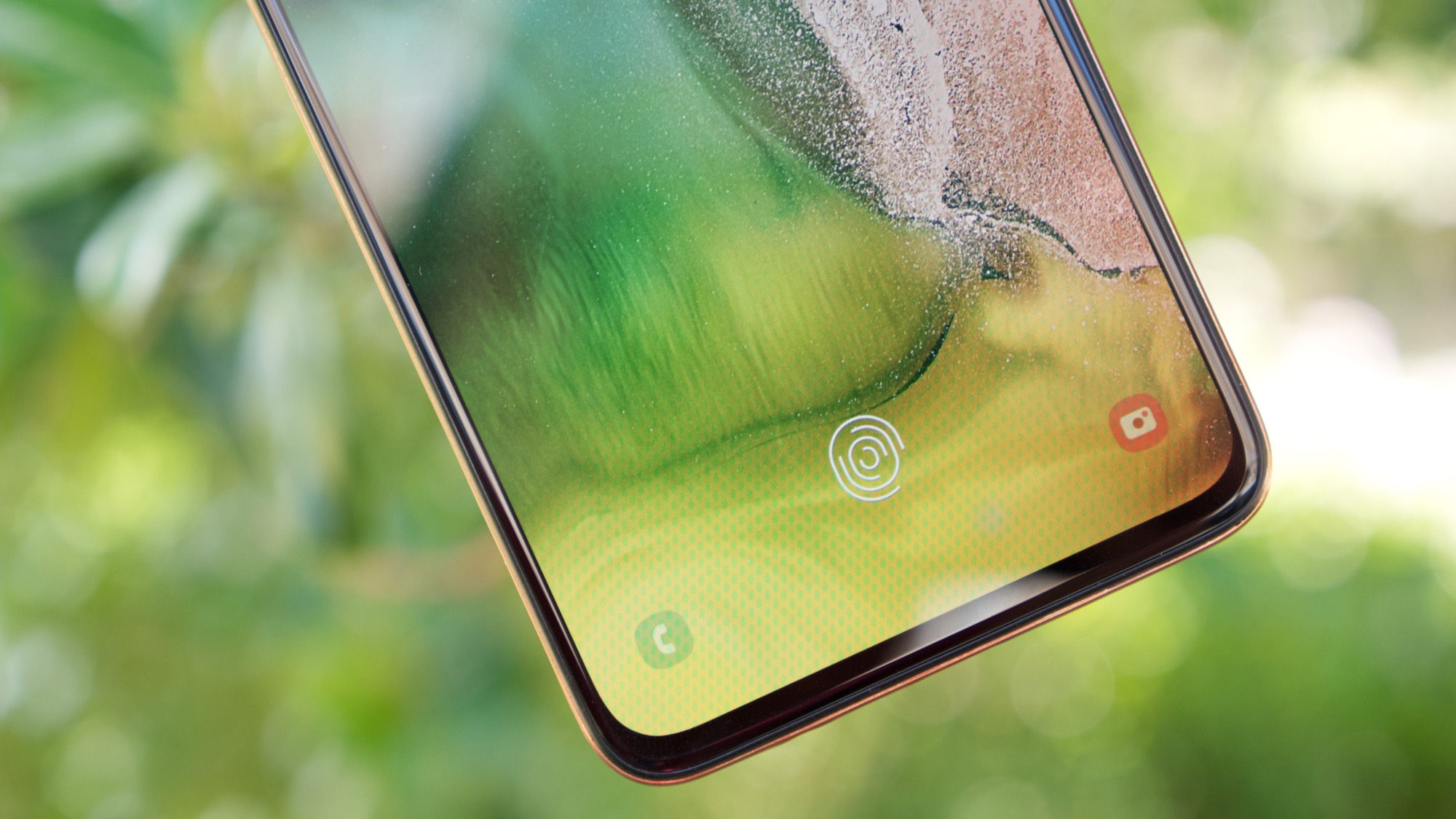 Framsidan täcks av en stor skärm med relativt tunna skärmkanter som ger telefonen ett modernt utseende. Till skillnad från Galaxy S-serien saknar A70 rundade skärmsidor. Det kan ses som en fördel eftersom rundade sidor kan göra det lätt att trycka på skärmen av misstag. I skärmen finns en inbyggd fingeravtrycksläsare som använder sig av optisk läsarteknik, som tyvärr är långsammare och mindre pålitlig än den ultraljudbaserade teknik som används i Galaxy S10-familjen. Den optiska tekniken kan vara både relativt snabb och pålitlig men Samsung har inte lyckats med sin implementering i Galaxy A70. Fingeravtrycksläsaren är oerhört långsam med en upplåsningstid på upp till två sekunder i vissa fall. Som det enda säkra biometriska säkerhetssystemet i hela telefonen, lyckas den dåliga läsaren sätta ett stort hinder för hela användarupplevelsen. Samsung borde ha satsat på en billigare och mer pålitlig kapacitiv läsare.