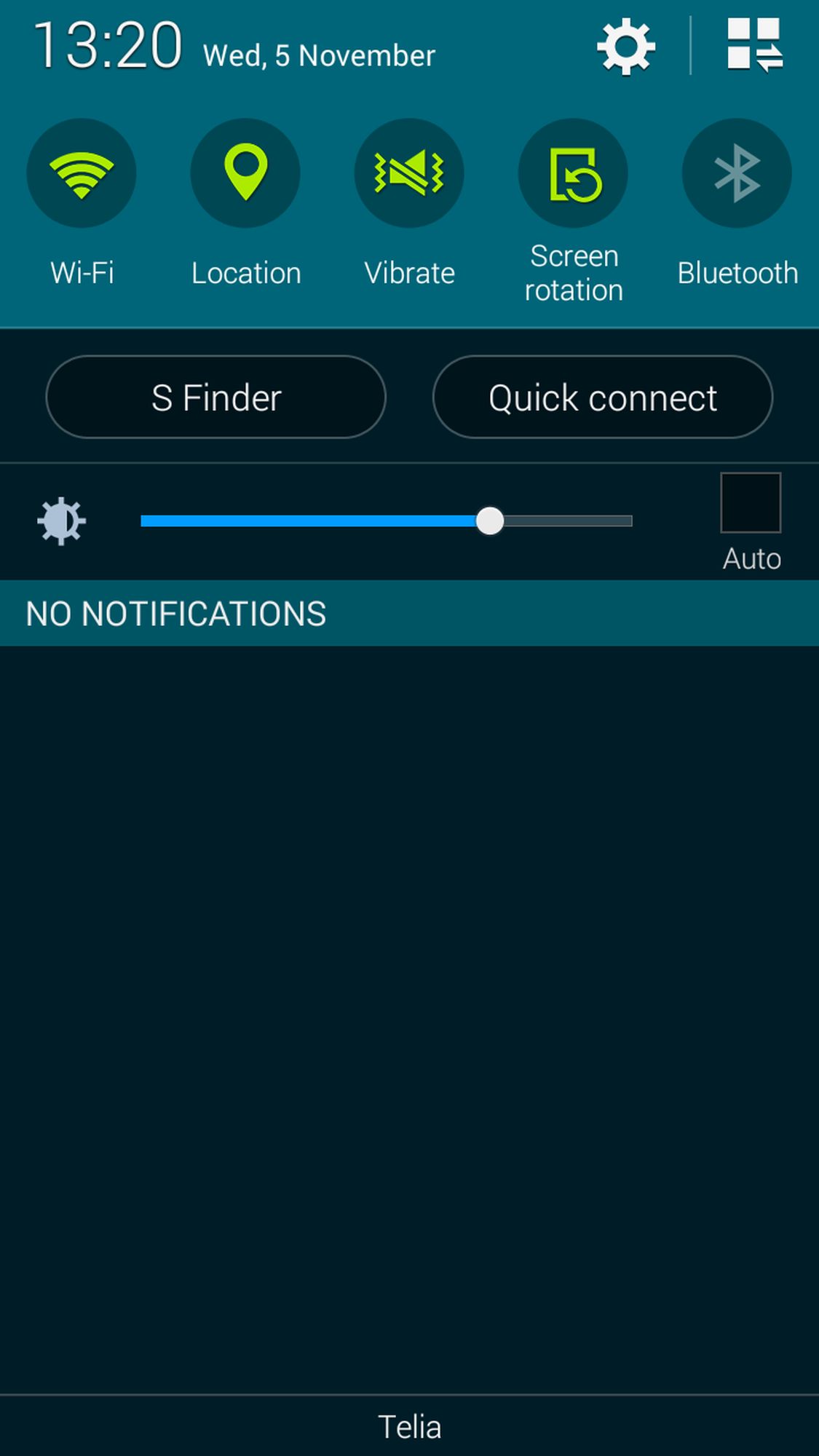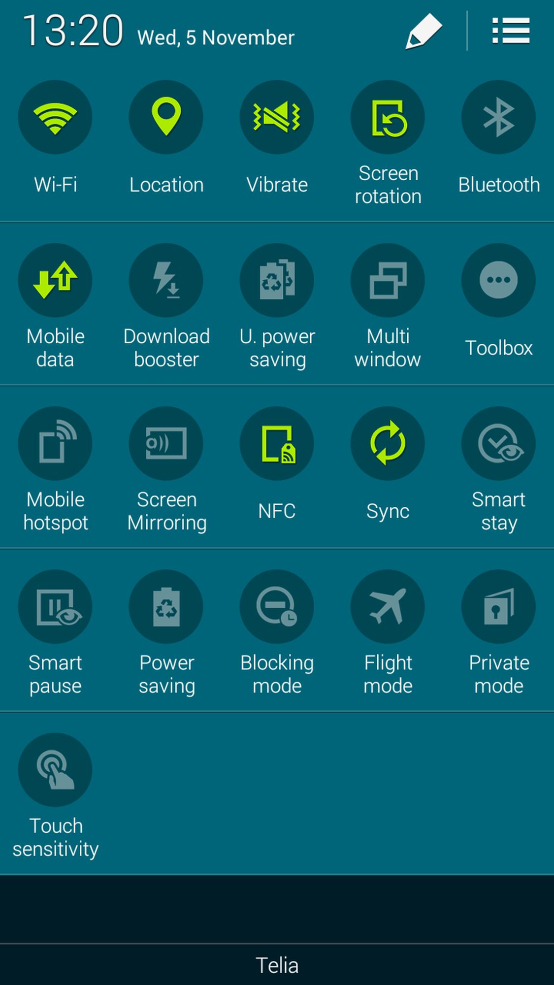 I notifikationslisten har Samsung snabb tillgång till fem toggle-ikoner, ett reglage för skärmens ljusstyrka och genvägar till telefoninställningarna, sökverktyget S Finder samt Quick connect, som är ett Bonjour-liknande verktyg för att snabbt upptäcka närliggande nätverksenheter för fildelning eller annan anslutning. Utöver de fem toggle-knappar som redan finns där finns en verktygslåda med ytterligare 16.