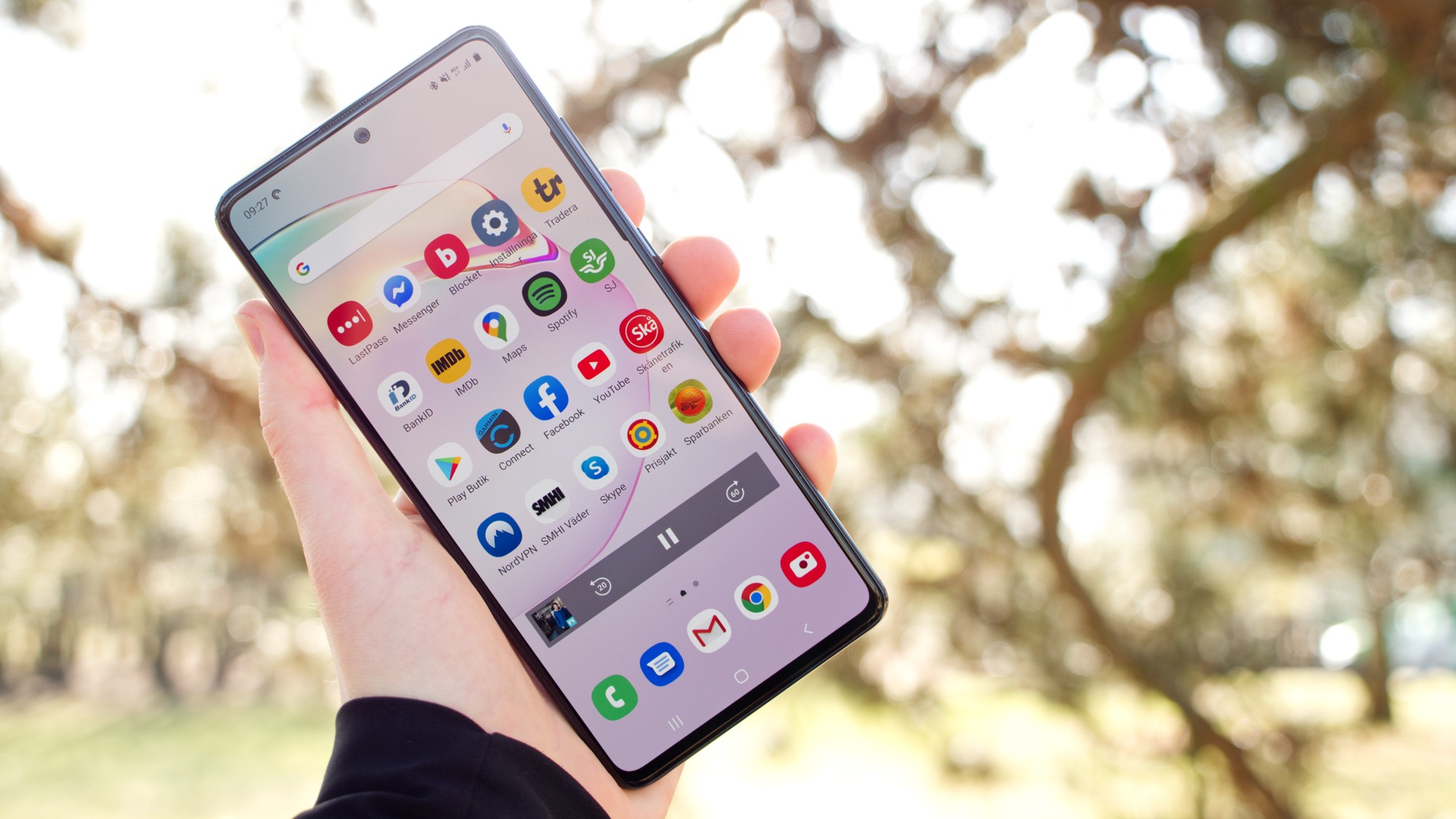 Samsung Galaxy Note 10 Lite har en skärm som påminner väldigt mycket om skärmen i S10 Lite. Den verkar dock inte vara identisk. Den har samma storlek, 6,7 tum och samma uppplösning, 1 080 x 2 400, men ser definitivt annorlunda ut. Den når 600 nits i maximal ljusstyrka, vilket är bra men märkbart lägre än S10 Lites 680 nits. Ett mer kalltblått ”Naturligt” läge gör dessutom att den inte riktigt ser lika naturligt balanserad ut. Det gör tyvärr att vi skulle beskriva skärmen i Note 10 Lite som en ganska medioker skärm för sitt pris. Vi hade definitivt förväntat oss mer från Samsung. Den enda större trösten är det utmärkta stödet för en aktiv penna.
