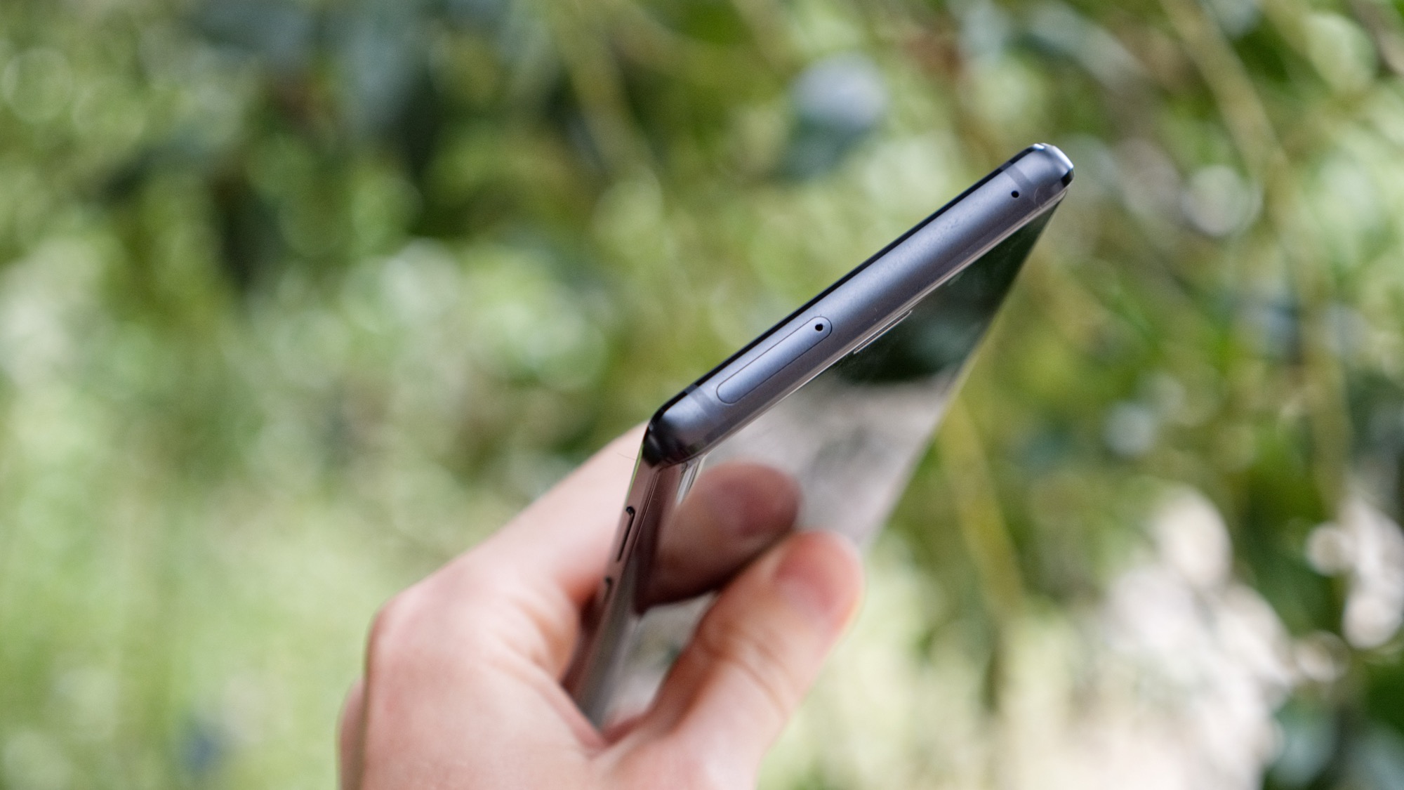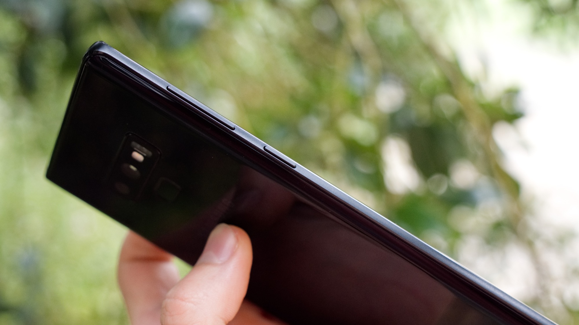 Note 9 har metallsidor som sträcker sig som ett band runt hela telefonen. På höger sida finns en på/av-knapp som är lätt att känna sig fram till och som ger bra fysisk återkoppling. Eftersom den sitter som en ensam knapp på sin egen sida är det också svårt att blanda ihop den med någon annan knapp.
