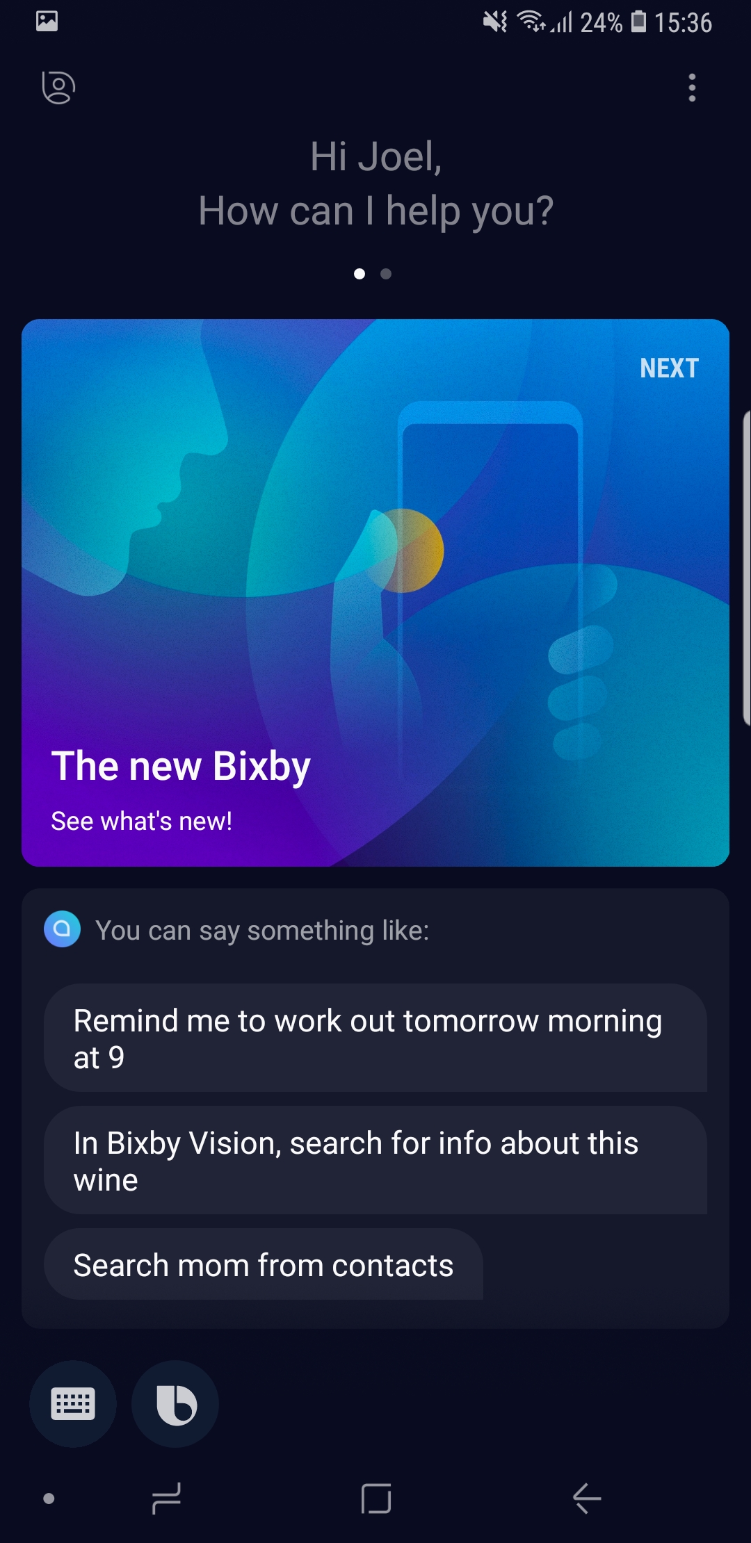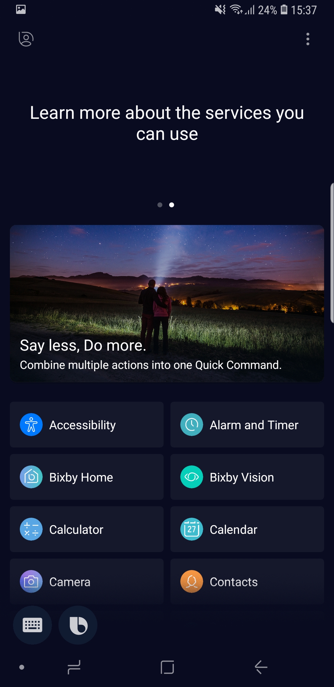Samsung fortsätter att inkludera sin egen röstassistent kallad Bixby. Den är bäst på att hantera uppgifter som har med telefonen att göra. Den kan till exempel användas för att snabbt justera inställningar som annars skulle kräva 4–5 klick i menyer för att hitta. Assistenten kan startas genom att användaren säger ”Hey Bixby” eller genom att Bixby-knappen trycks in. När den är aktiverad är det dock engelska som gäller. När Google Assistant nu har lanserats på svenska i Sverige har Bixby med andra ord stark konkurrens från en röstassistent som dessutom är mer universell. Bixbys enda stora styrka är därför justering av telefonens inställningar. För det snäva användningsområdet är det svårt att ens komma ihåg att Bixby existerar.