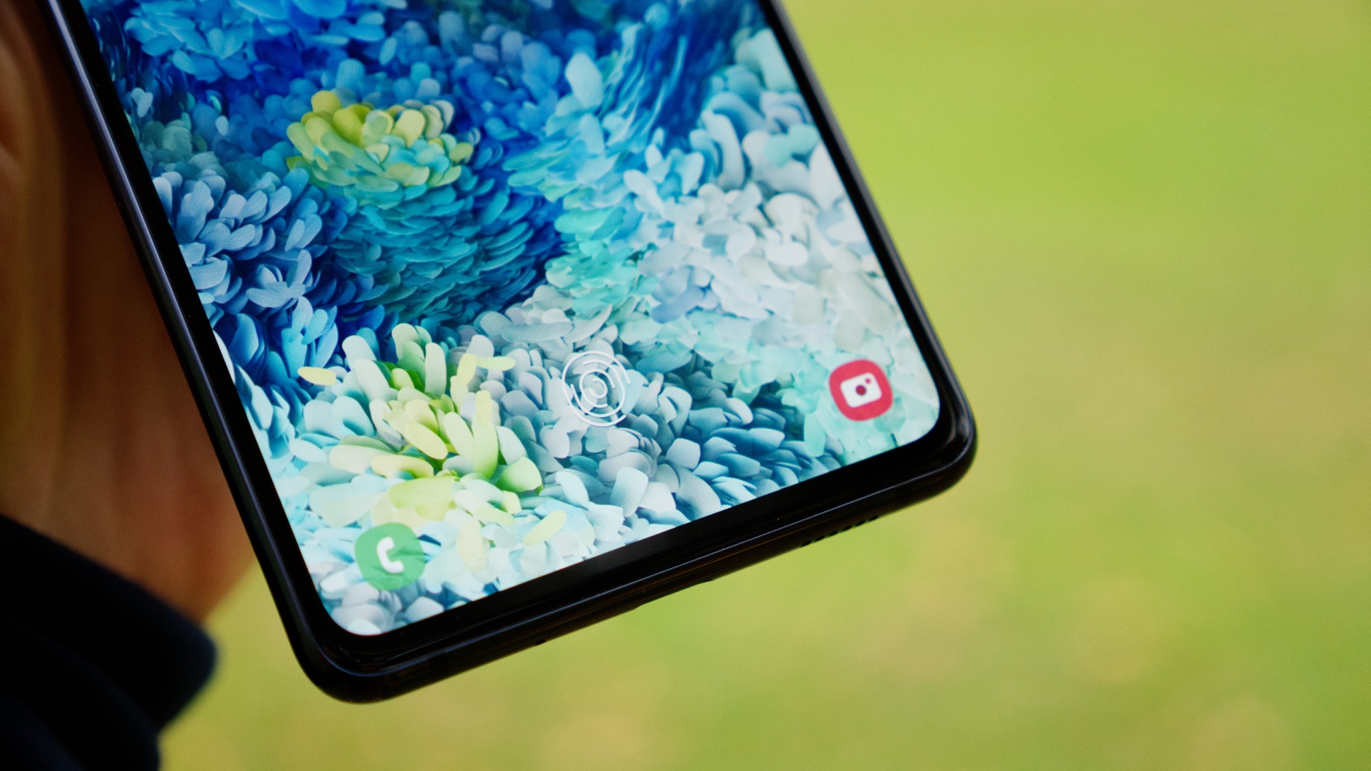 Ovanför skärmen finns en hörlur och ett par sensorer. Här finns ingen notislampa. Notiser och laddningsstatus indikeras istället med skärmen. I skärmen finns för övrigt också en fingeravtrycksläsare. Den skiljer sig från läsarna i de andra Galaxy S20-mobilerna eftersom den är optisk, inte ultraljud-baserad. Den är också placerad betydligt längre ner på skärmen. Den fungerar snabbt och pålitlig men är lite mer känslig för smutsiga och våta fingrar. I stora drag är det en skillnad som är ganska betydelselös.