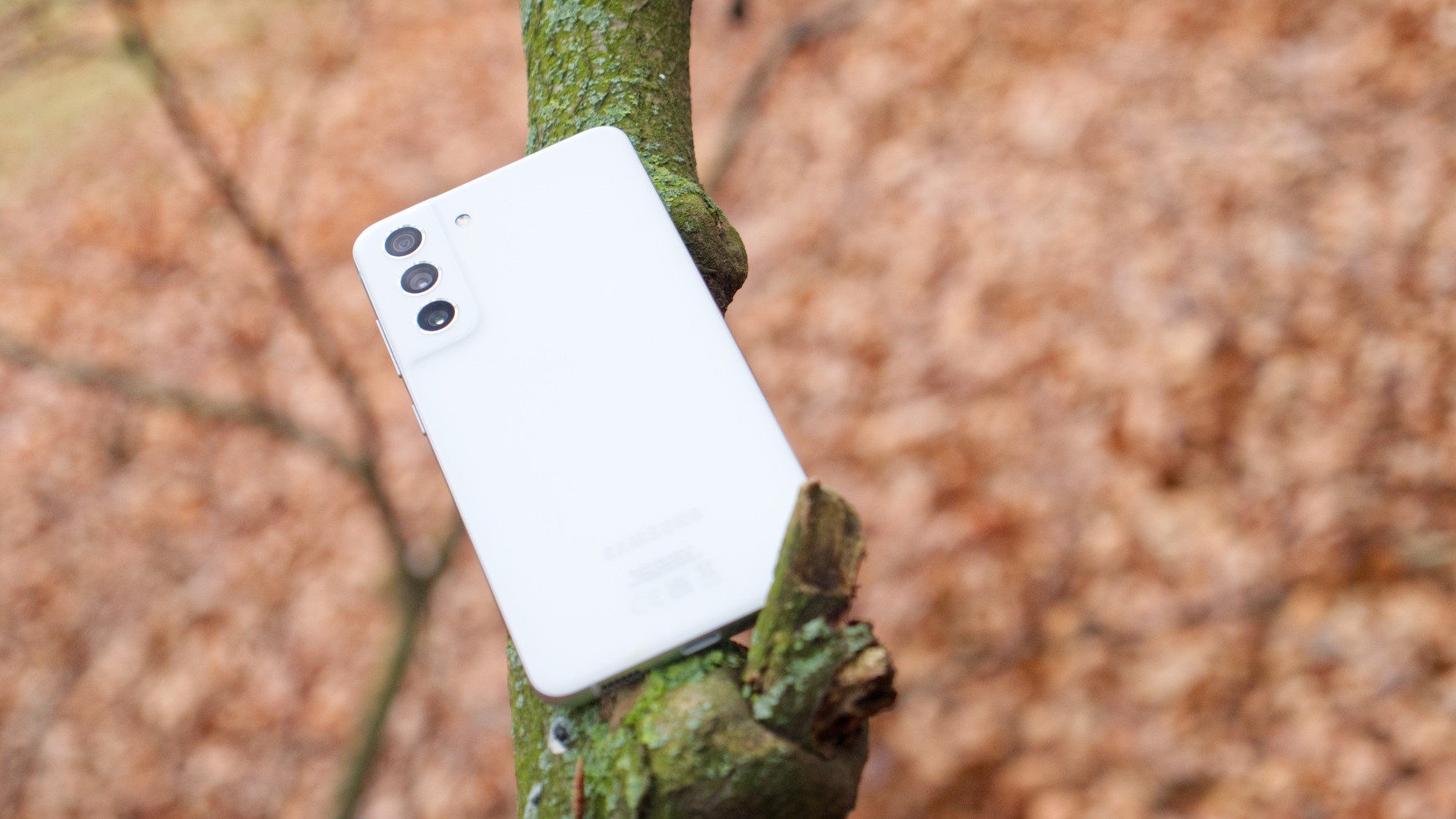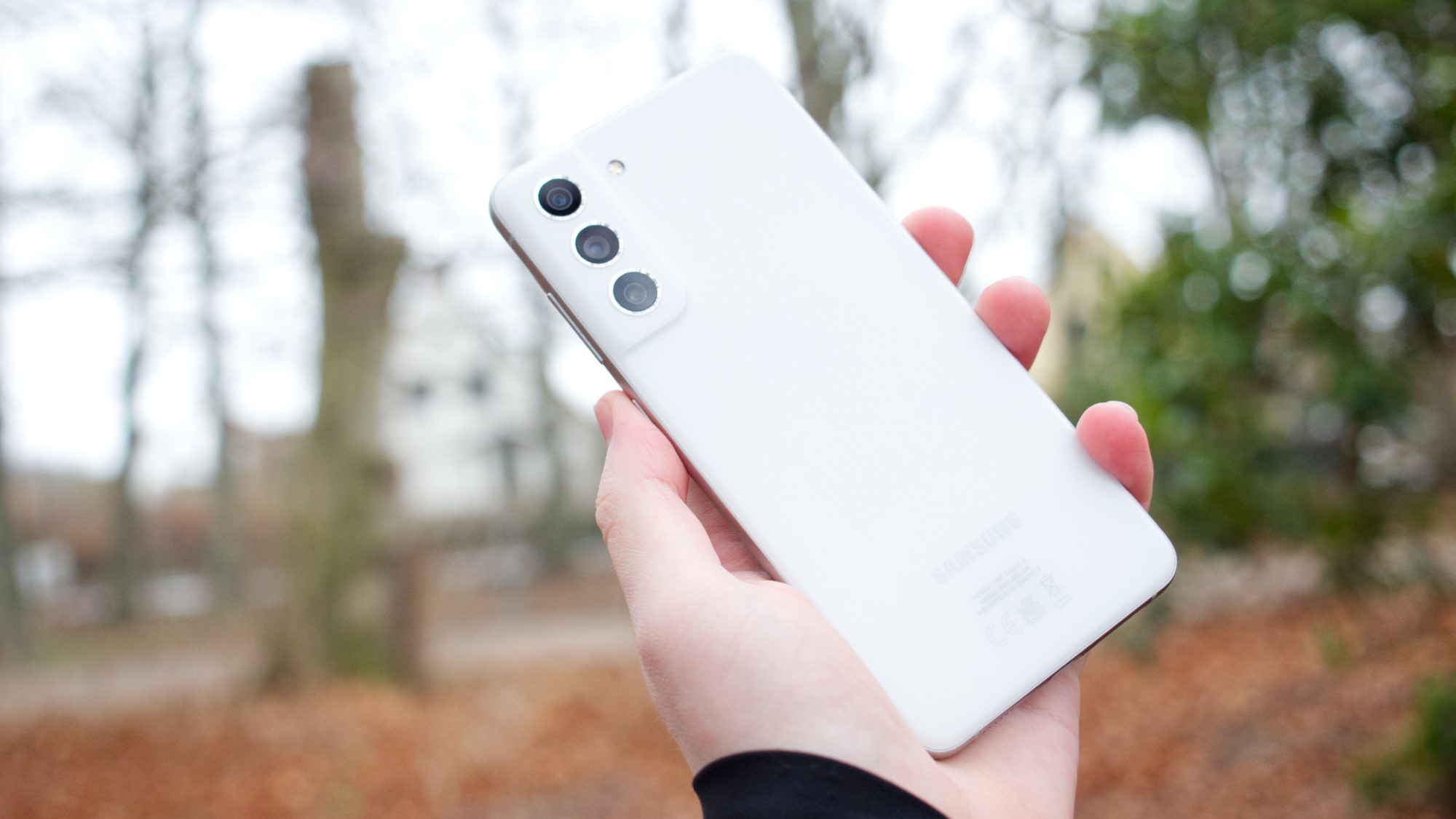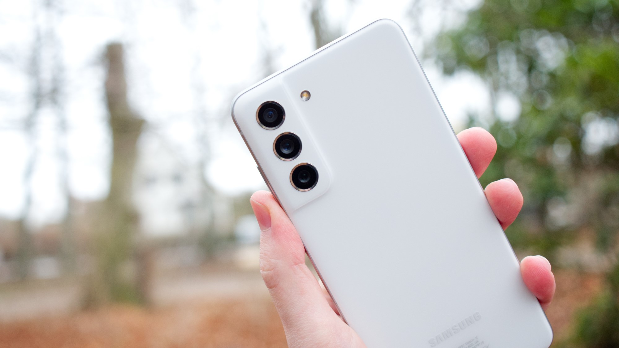 Baksidan har samma typ av design som resten av S21-serien. Den enda betydande skillnaden är att kameramodulen och resten av baksidan är gjord ett stycke plast, medan Galaxy S21 har en glasbaksida och ett metallhölje för kamerorna. Samsung har också gjort kameralinserna en gnutta mindre, vilket tyvärr ger dem ett lite billigare utseende. LED-lampan sitter i alla fall på samma plats som på syskonen och det samma gäller de komponenter som gömmer sig bakom bakstycket. Här finns stöd för snabb trådlös laddning och omvänd trådlös laddning, utöver tekniker såsom NFC. Plasten håller dessutom samma tätning mot resten av telefonen som glaset på S21. Det betyder att S21 FE erbjuder IP68-certifiering för vattentålighet. Det är en tacksam och ovanlig egenskap i klassen.