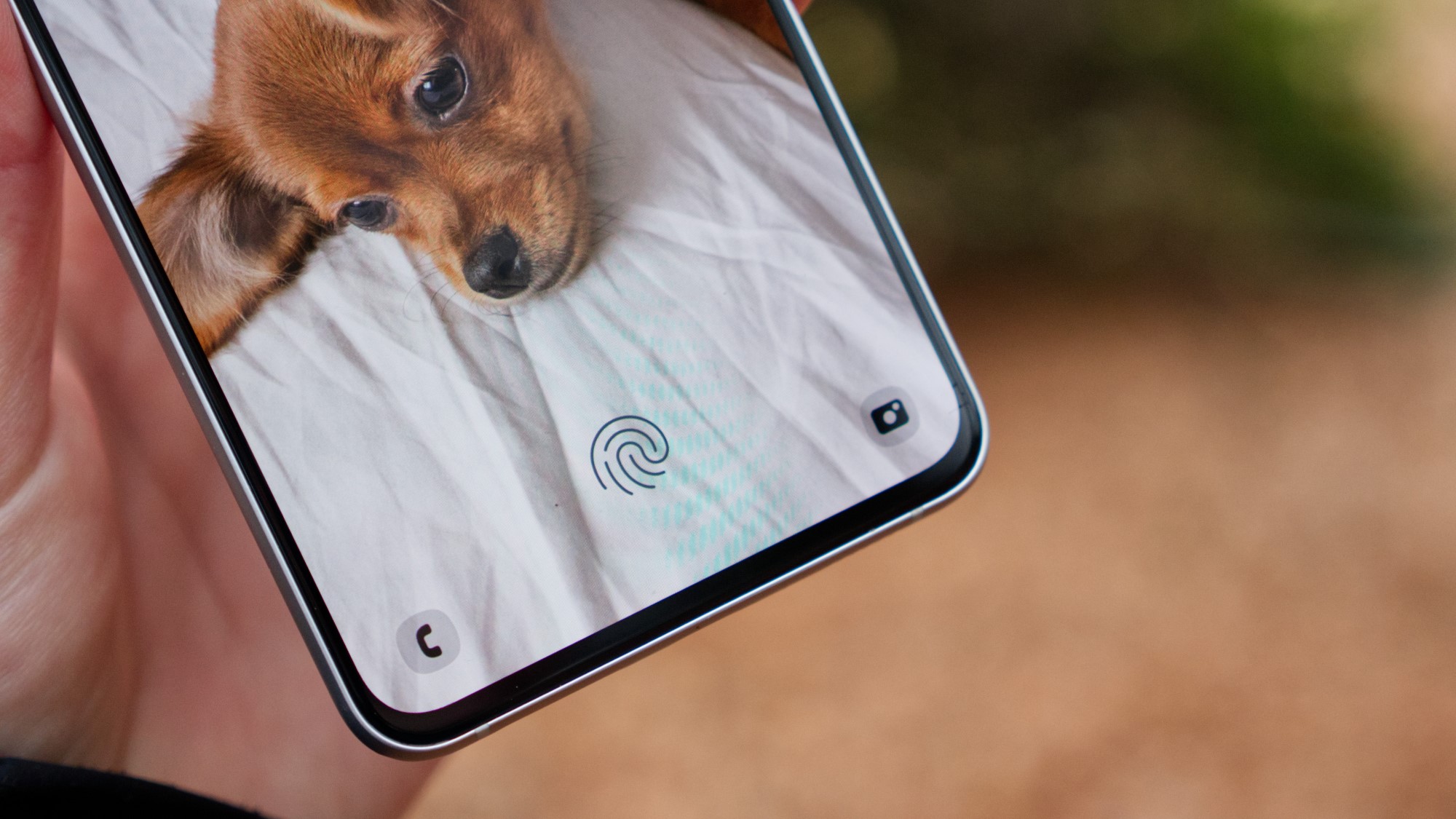 Skärmen har rundade hörn, ett hål längs överkanten för selfiekameran och en inbyggd fingeravtrycksläsare i skärmen. Läsaren fungerar generellt bra och pålitligt men den är knappast bättre än tidigare. Skärminbyggda fingeravtrycksläsare kan fortfarande vara svåra att använda när fingret inte är helt rent eller perfekt placerat.