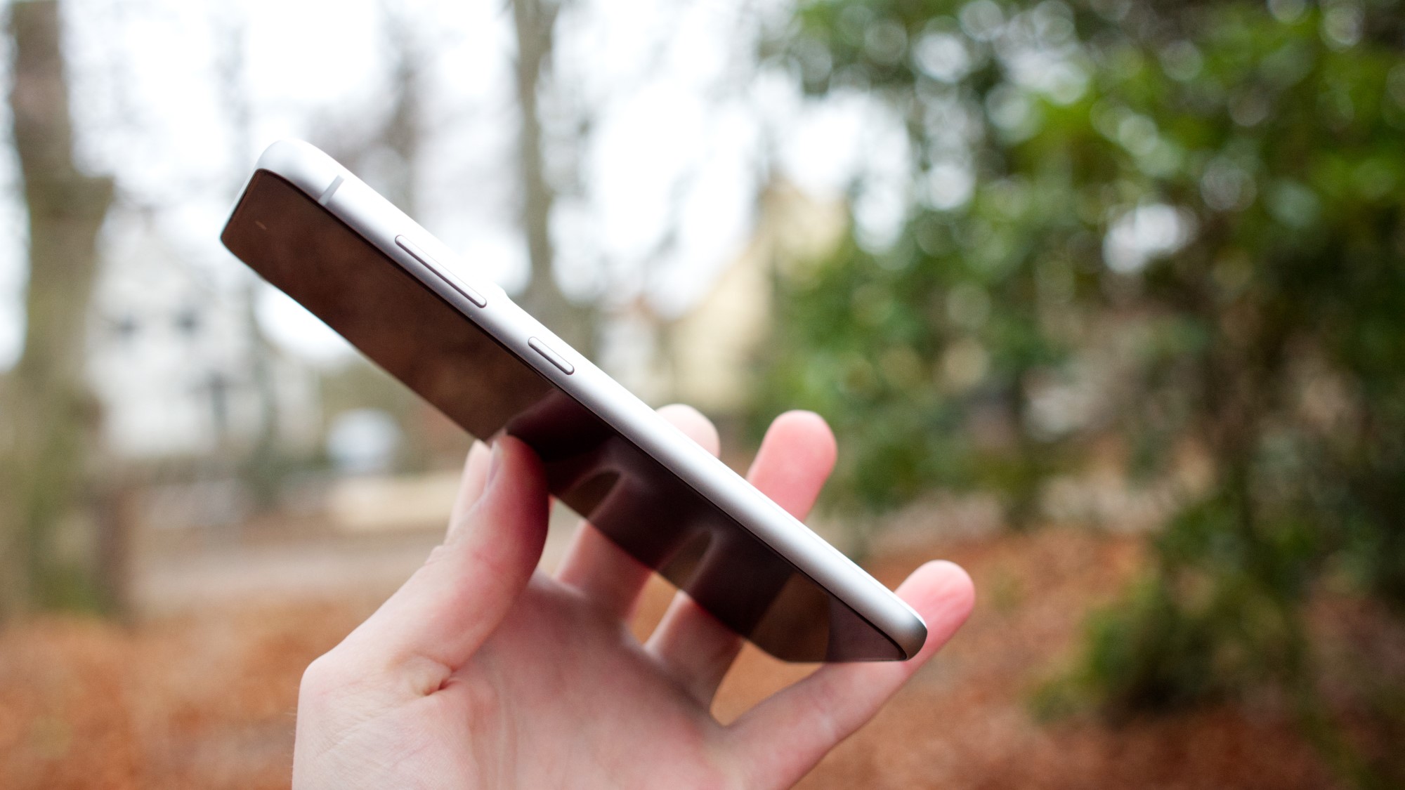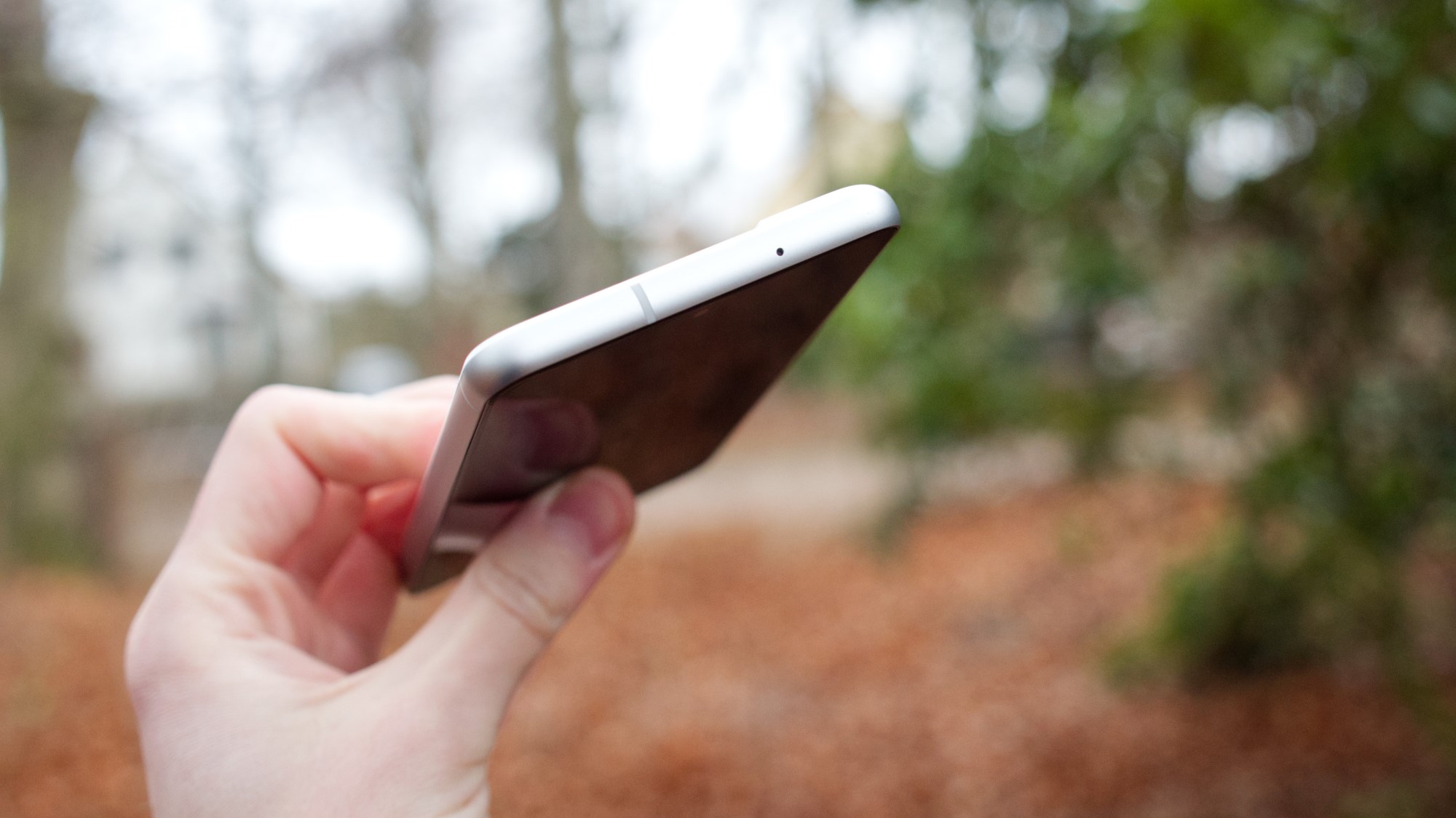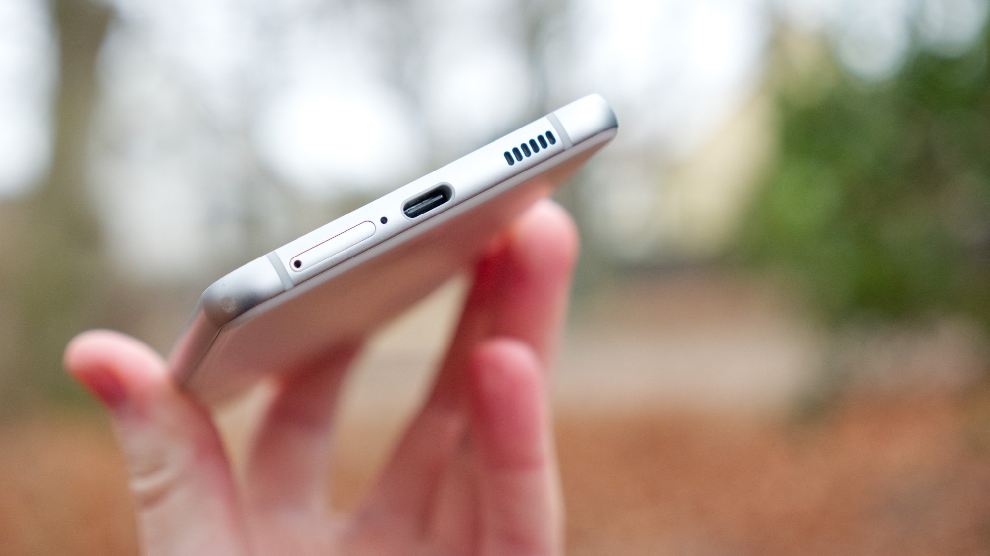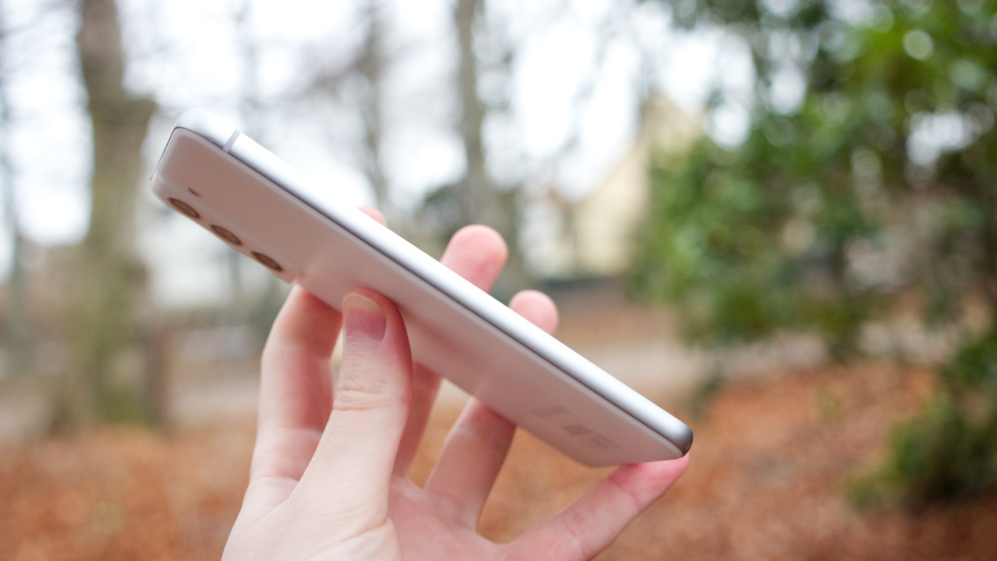 Med undantag för plastbaksidan har S21 FE en design som är i praktiken identisk med S21. Sidorna är gjorda av aluminium, som dock har en matt finish. Samsung verkar ge sina modeller samma distinktion som Apple gör mellan sina glansiga flaggskepp och matta bas-modeller. Längs den matta högersidan finns i alla fall en på/av-knapp och två volymknappar. De ger bra fysisk återkoppling och är enkla att använda. Längs ovansidan finns en sekundär mikrofon medan vänster sida är helt tom. SIM-kortläsaren sitter på undersidan. Här finns utrymme för dubbla SIM-kort men inget stöd för microSD-kort. Det är en tråkig nedgradering från S20 FE. Längs undersidan finns även en mikrofon, en USB C-port och en högtalare.