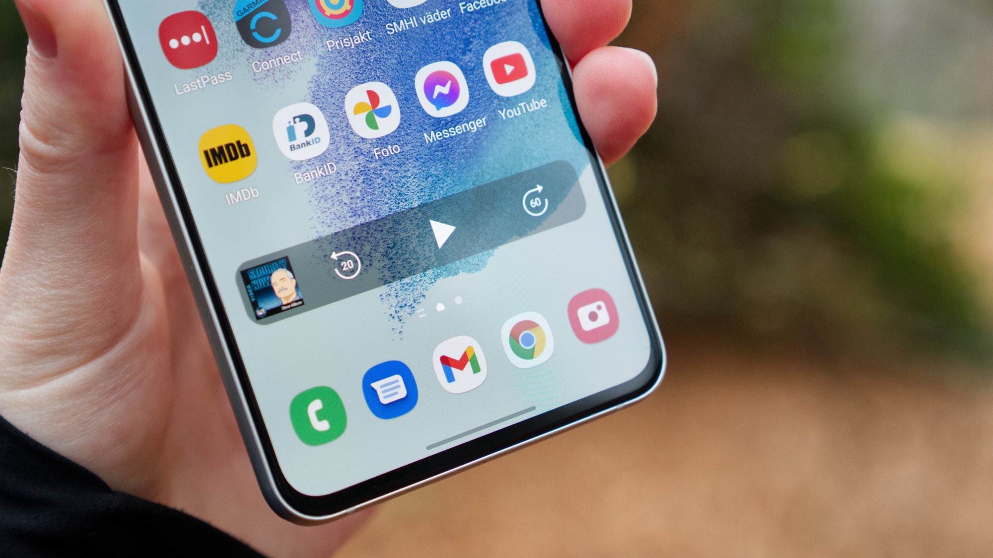 Framsidan bjuder inte på några överraskningar. Den största förändringen sedan S20 FE är skärmen och skärmramarna. Storleken har minskat från 6,5 till 6,4 tum och smalare skärmramar betyder att telefonens yttermått gör skillnad. Den är till exempel fyra millimeter kortare. Det märks vid användning. Med det sagt ligger S21 FE fortfarande i mellanlandet mellan den lilla S21 och stora S21+. S21 FE är inte en liten telefon.