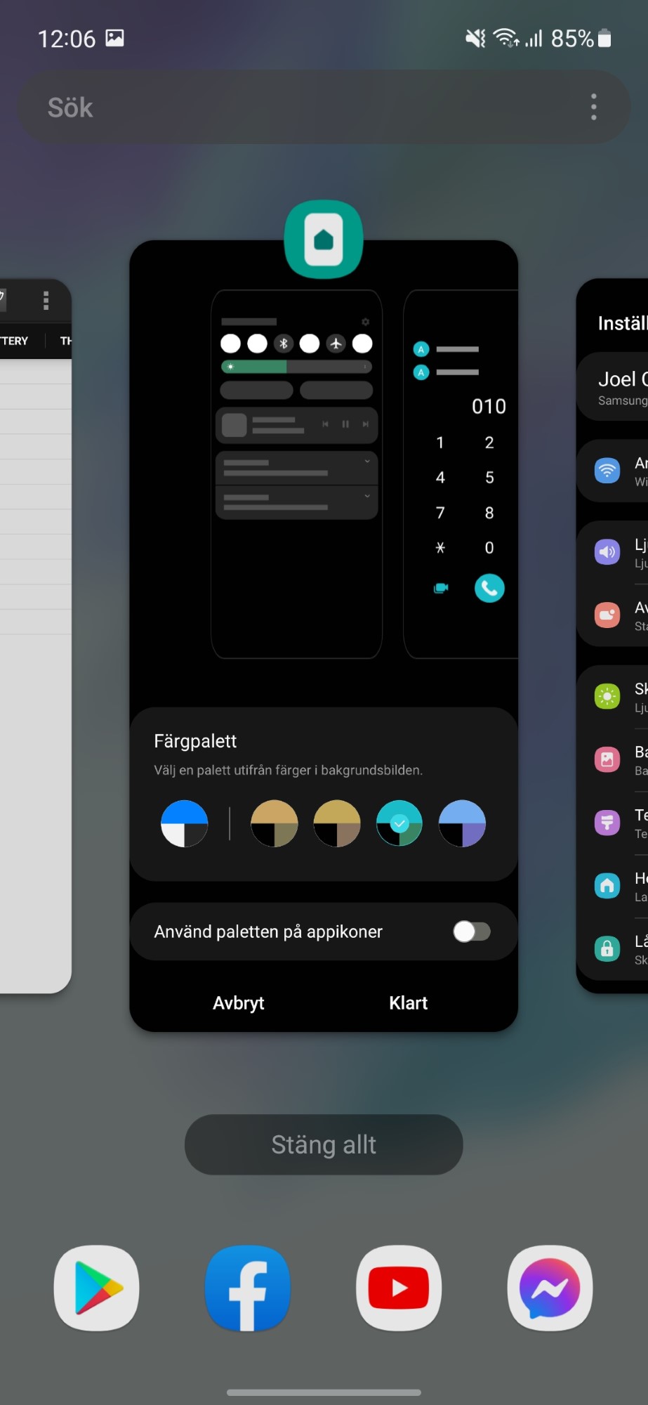 Samsung OneUI 4 fortsätter i tidigare versioners fotspår. Det inkluderar starka likheter med OneUI 3. Det står i starkt kontrast mot Android 12, som har stora designförändringar. Det betyder inte att Samsung inte har implementerat nyheterna i Android 12. Det finns till exempel ett nytt system för att matcha systemfärgerna med bakgrundsbilden. Samsung har ett eget användargränssnitt för funktionen men principerna är desamma. Telefonen analyserar bakgrundsbilden och ger oss flera alternativ att välja mellan för att ställa in färgen på snabbgenvägar, systeminställningar och standardappar.