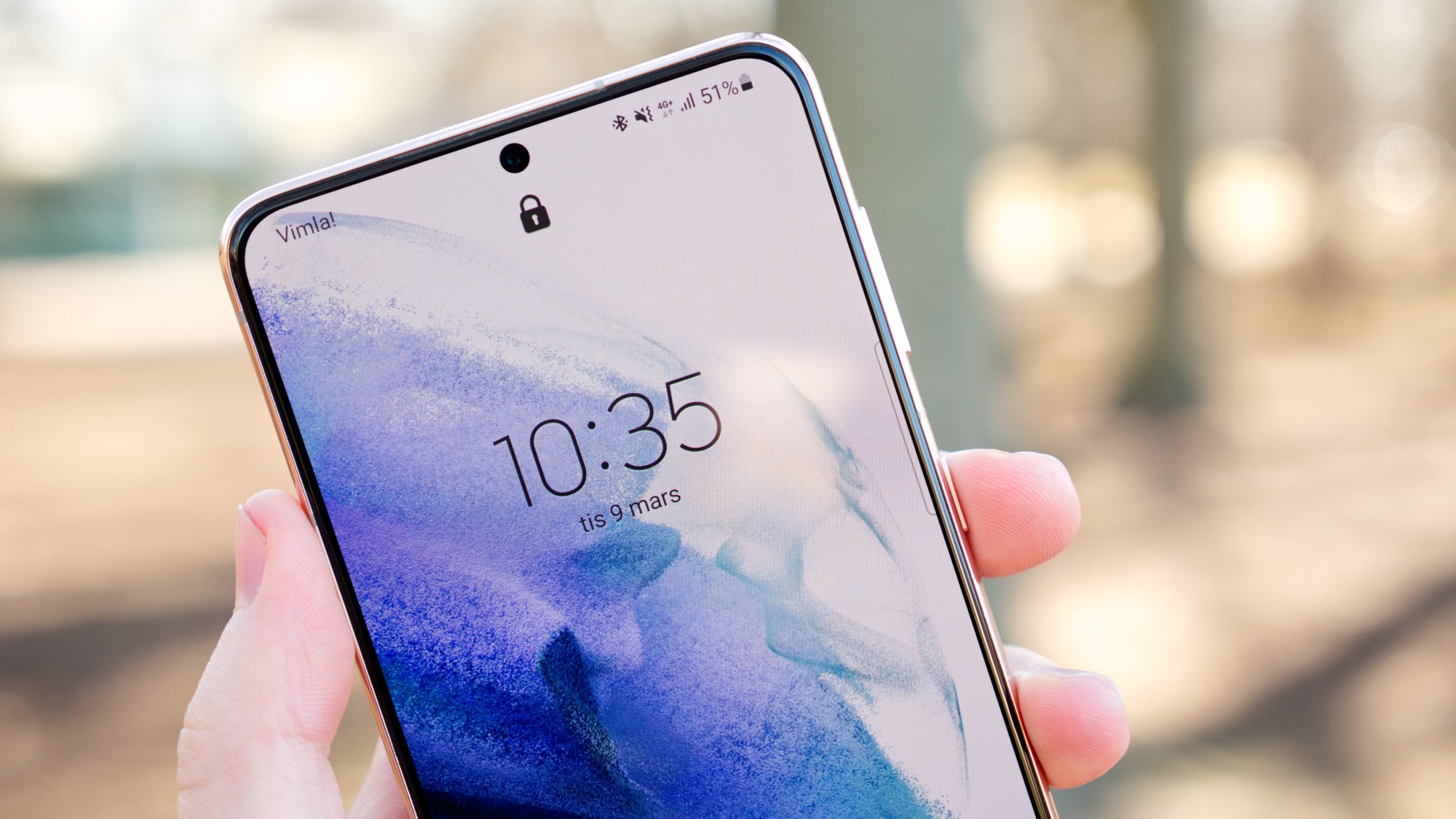 Framsidan av S21+ bjuder på en stor skärm med tunna skärmramar. Designen är nära identisk med föregångaren, med ett betydande undantag: skärmen är inte längre böjd. Det gör att den är billigare att byta ut och att telefonen är en gnutta bredare. Den böjda skärmen på föregångaren minskade skärmens bredd, sett framifrån. Det gör Galaxy S21+ två millimeter bredare än S20+. Det är en märkbar skillnad som vi tror kan uppskattas av användare som stör sig på rundade skärmars tendens att registrera ofrivilliga tryck.