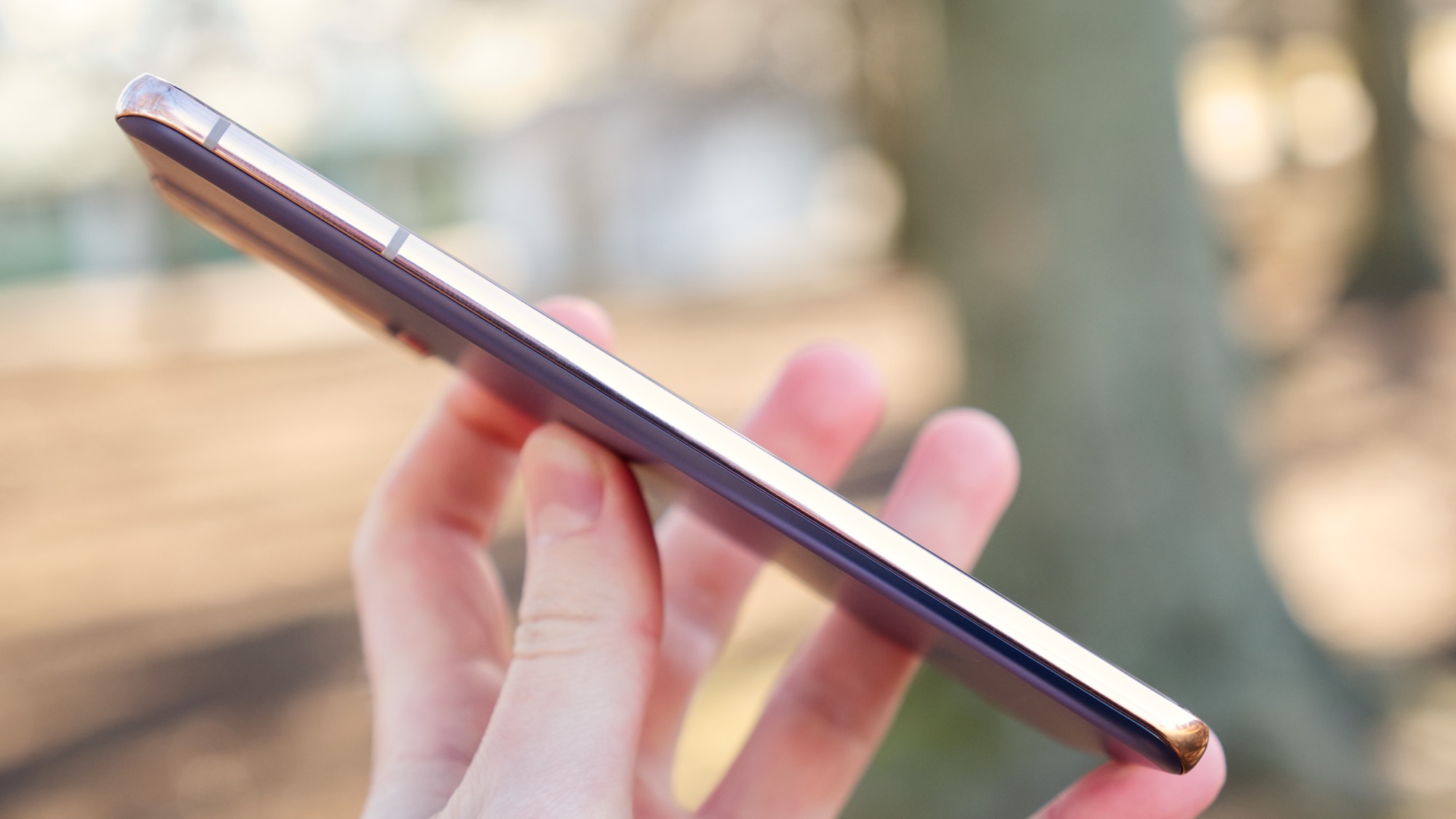 Sidorna av Galaxy S21+ är gjorda av polerad aluminium. I jämförelse med föregångarna i S-serien, är sidorna betydligt större på S21+. Anledningen är att skärmen på framsidan inte längre är rundad. Mer om det senare. På vänster sida finns i alla fall alla knappar. Här finns en på/av-knapp och två volymknappar. Alla är praktiskt placerade och ger bra fysisk återkoppling. Längs ovansidan finns hål för en mikrofon och undersidan bjuder på en högtalare, USB C-port, mikrofon och en kortläsare.