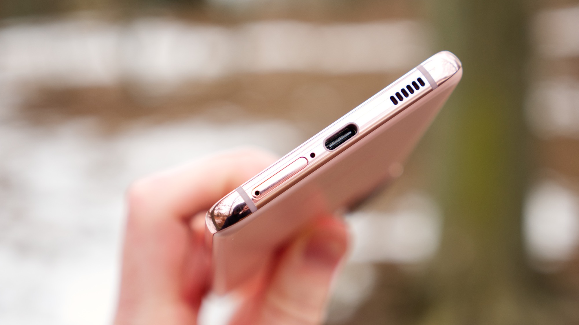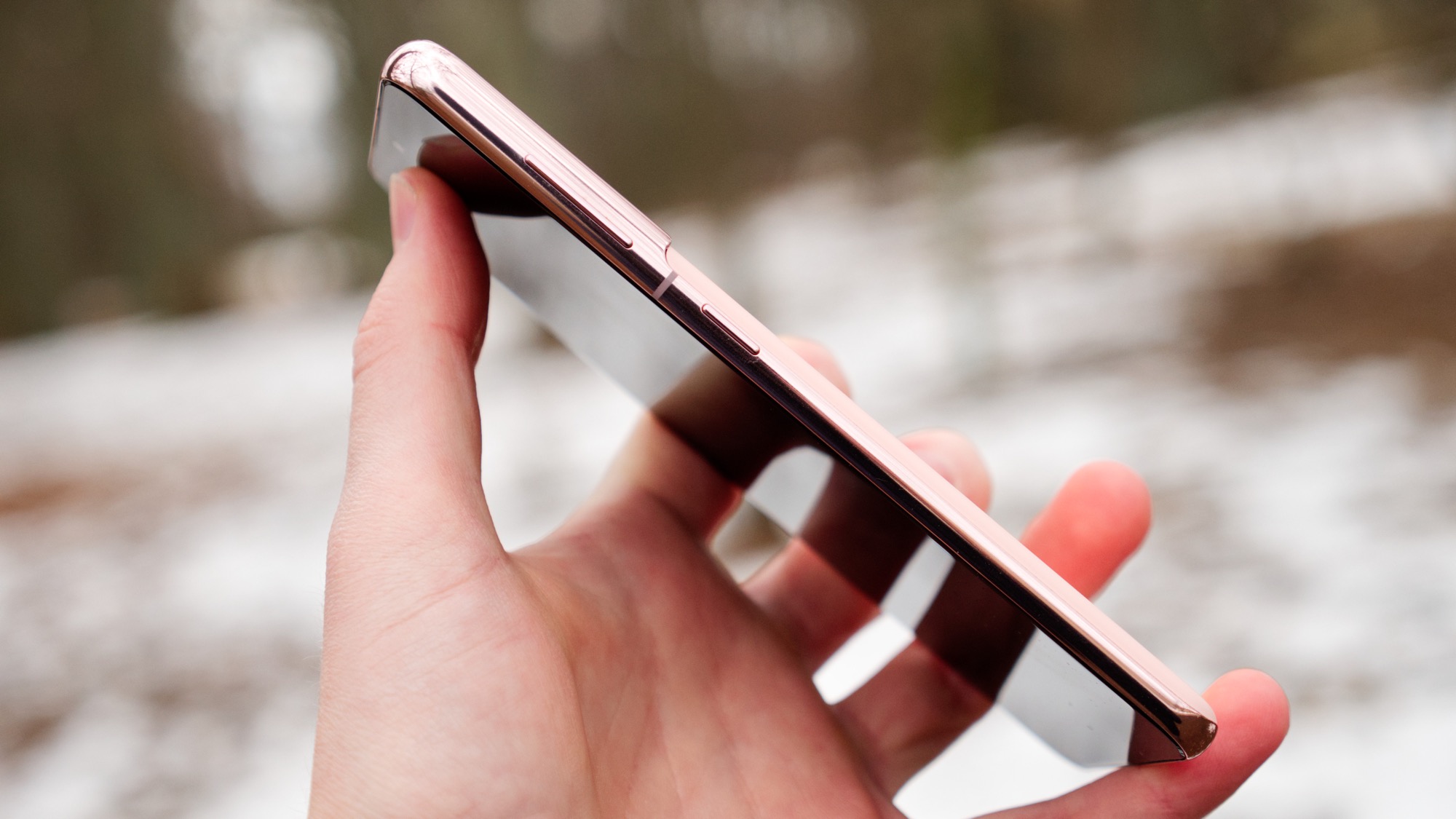 Sidorna av Galaxy S21 är gjorda av polerad aluminium. I jämförelse med föregångarna i S-serien, är sidorna betydligt större på S21. Anledningen är att skärmen på framsidan inte längre är rundad. Mer om det senare. På vänster sida finns i alla fall alla knappar. Här finns en på/av-knapp och två volymknappar. Alla är praktiskt placerade och ger bra fysisk återkoppling. Längs ovansidan finns hål för en mikrofon och undersidan bjuder på en högtalare, USB C-port, mikrofon och en kortläsare.