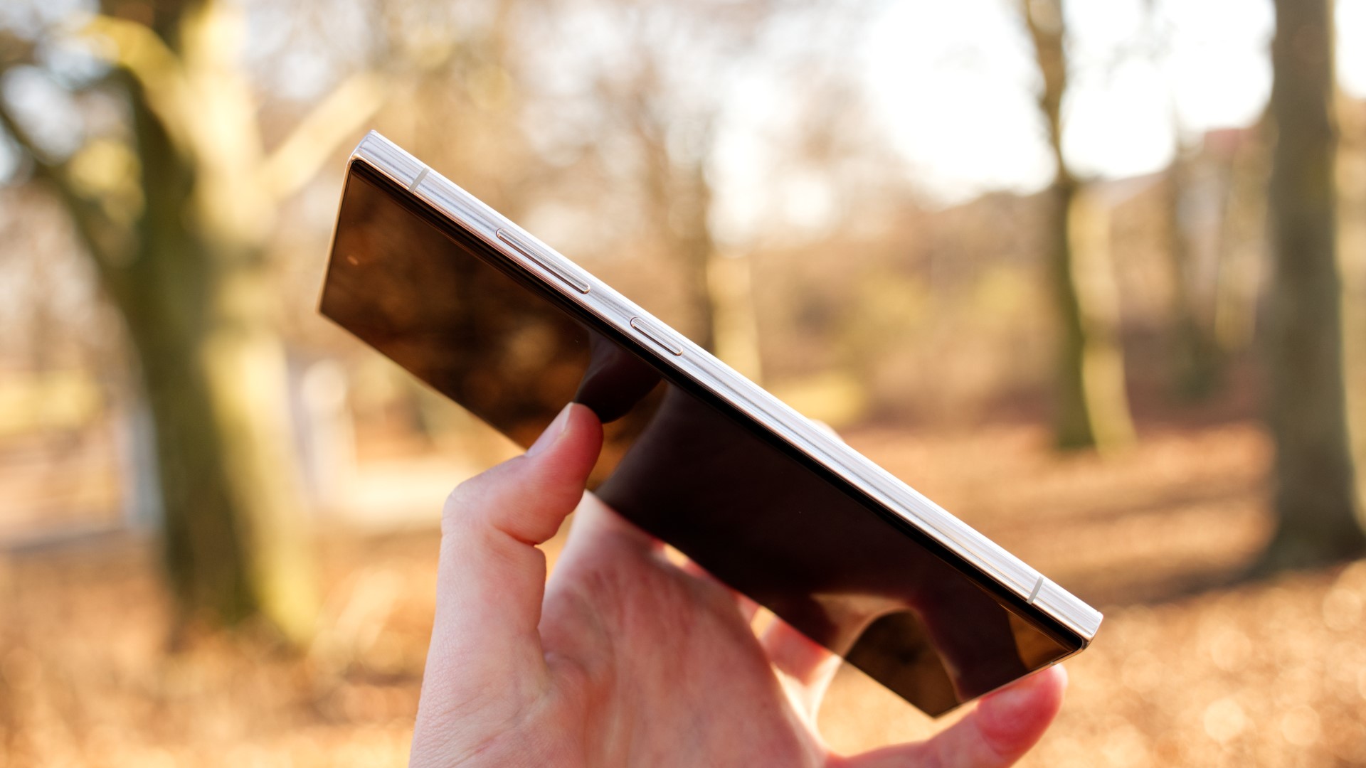 På baksidan är det mesta oförändrat. Det inkluderar fyra kameror, ett par sensorer och en LED-lampa som sticker ut i enskilda kamera-öar och som inte omringas av en kameramodul, som annars är så populärt på marknaden. Baksidan är gjord av glas, en ny variant från Corning kallad Gorilla Glass Victus 2 som ska klara fall på betong från en meters höjd. Tappar du den från huvudhöjd bör du med andra ord ha installerat ett skal på telefonen. Framsidan är ömtålig och kostar någonstans norr om 3 000 kronor att byta ut. Skärmen har tunna ramar och snävt rundade hörn. I skärmen finns en snabb och pålitlig fingeravtrycksläsare.