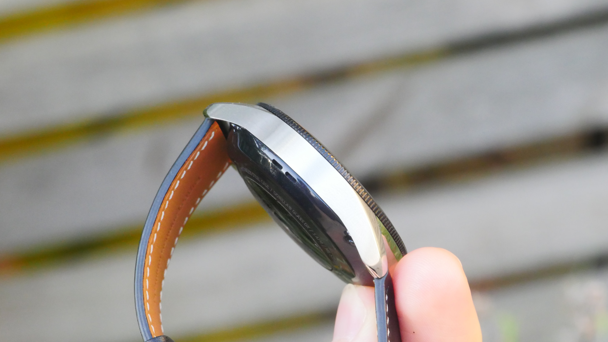 På klockans högra sida hittar vi två knappar. Dessa ger ifrån sig ganska tydliga klick men ger inte mycket till fysisk återkoppling när vi trycker på dem. Den vänstra sidan är till synes utan detaljer. En högtalare gömmer sig dock precis på kanten av undersidans plast och döljs smidigt av den mer utstickande metallkroppen. Klockan har också en öppning för den inbyggda mikrofonen som gömmer sig på ovansidan och skyms av armbandets fäste.