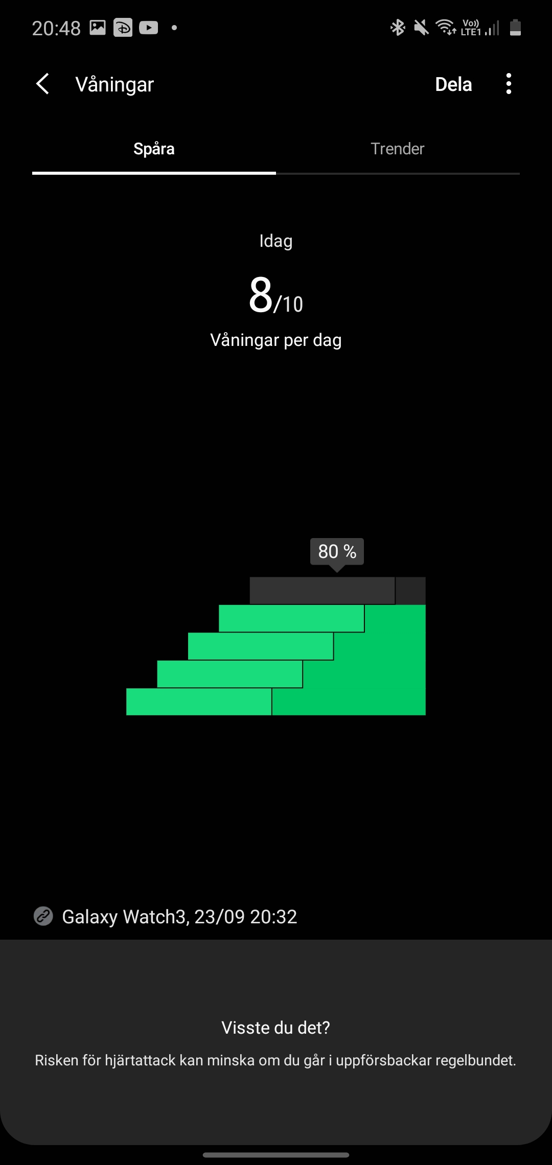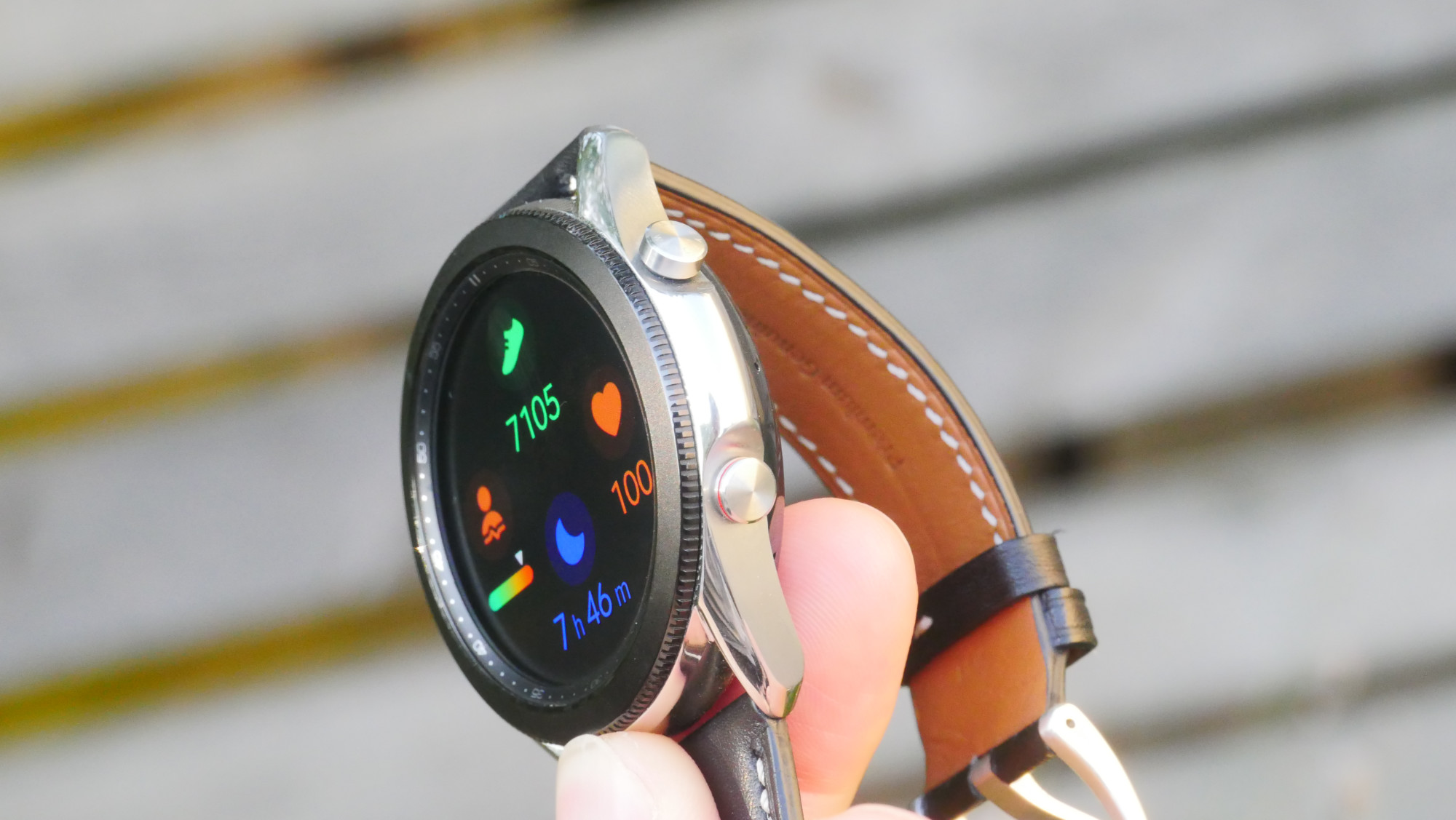 Som stegräknare har Samsungs klockor aldrig varit bäst men inte heller sämst. Galaxy Watch 3 räknar precis som den två år gamla modellen sex steg för lite under vårt 500 stegs-test. Detta är bättre än Huawei Watch GT 2, som räknade runt tio steg för mycket, men sämre än Huaweis Watch GT 2e som bara räknade ett steg för mycket. Om vi tar av oss klockan, använder Samsung Health gärna telefonens stegräknare för att kompensera. Klockan räknar också trappor, eller våningar, som tre meters kontinuerlig ökning. När vi testar klockan ser vi att den räknar trappor korrekt. Detta fungerar både när vi går i faktiska trappor samt med höjdskillnader utomhus.