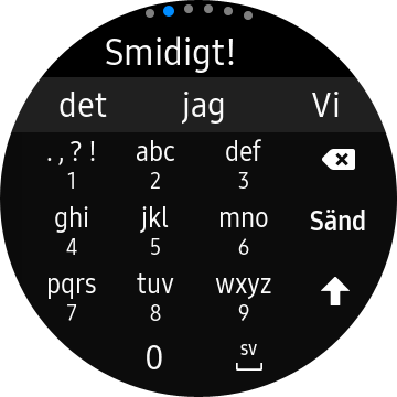 Galaxy Watch 3 tar emot och samlar telefonens notiser bredvid urtavlan. Dessa grupperas utifrån vilken app de kommer ifrån. Här kan vi välja att svepa bort notiser eller svara på dem. Appar såsom Twitter och Facebook låter oss snabbt ”gilla” meddelanden och inlägg. Annars har vi en drös snabbsvar, som vi också kan skapa själva, eller ett fullständigt T9-tangentbord. Den lilla skärmen är inte optimal för ett fullständigt tangentbord så vi uppskattar denna möjlighet. Vi kan också använda Bixby för röstdiktering men återigen endast på engelska och utan förmågan att skriva specialtecken.