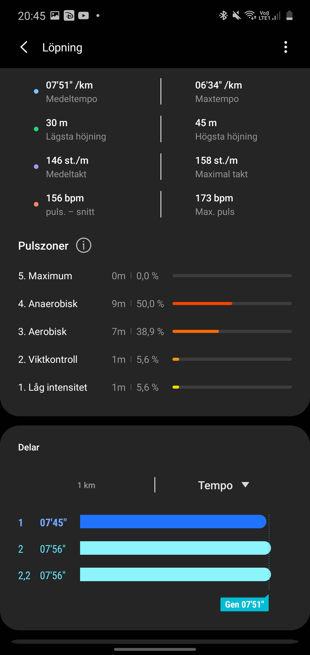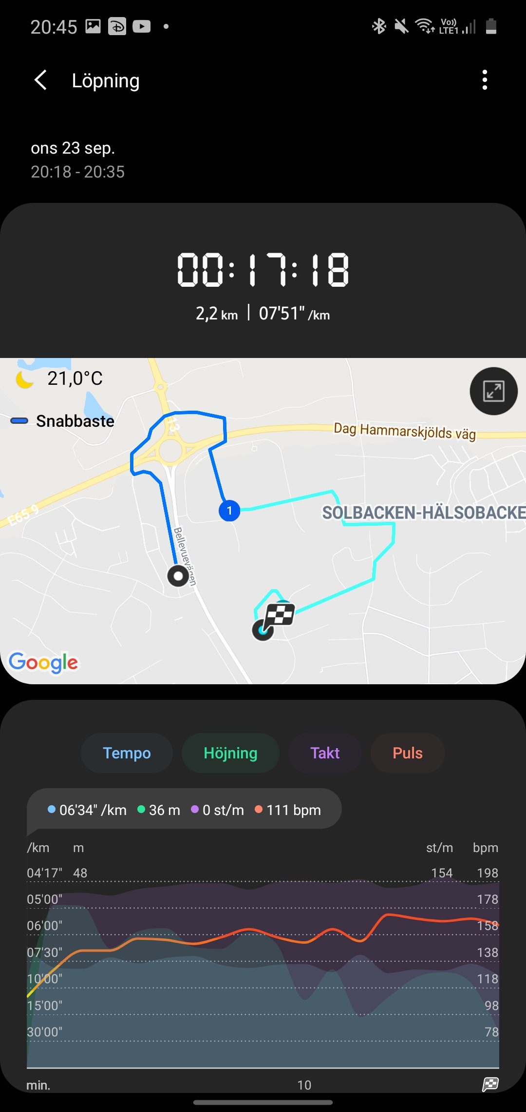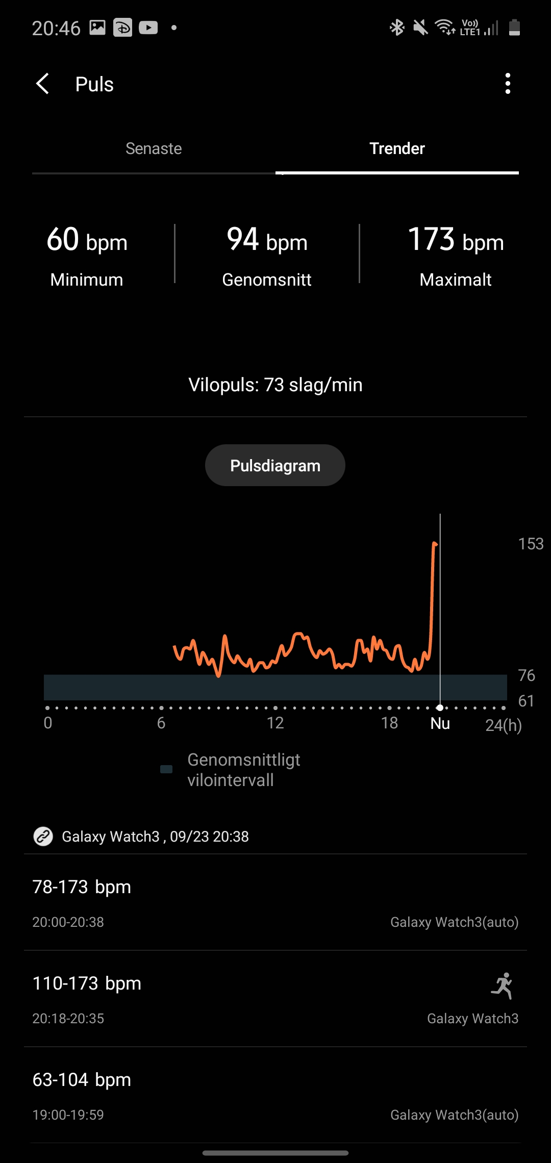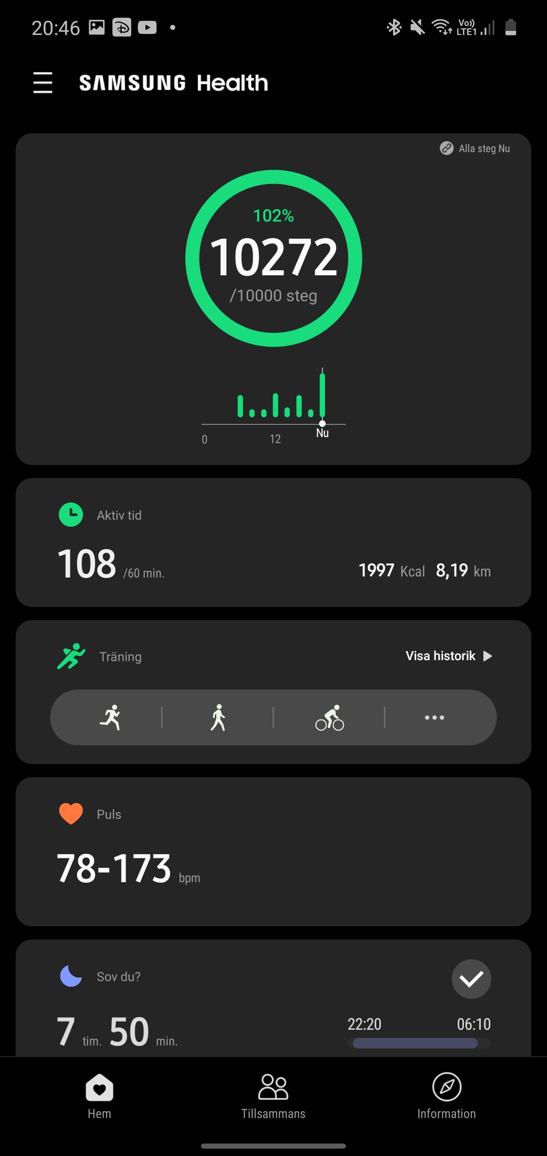 Pulsmätaren presterar varierat under vårt test. Under perioder av stillasittande ser vi ibland resultat med en godkänd felmarginal och ibland helt felaktiga värden. Vi har tidigare kritiserat Samsungs pulsmätare som opålitlig. Det är fortfarande fallet, även om vi ser förbättringar där den lyckas matcha Apple Watch 5 i perioder. I perioder sjunker eller stiger den utanför en godkänd felmarginal. Den är bättre men inte tillräckligt bra.