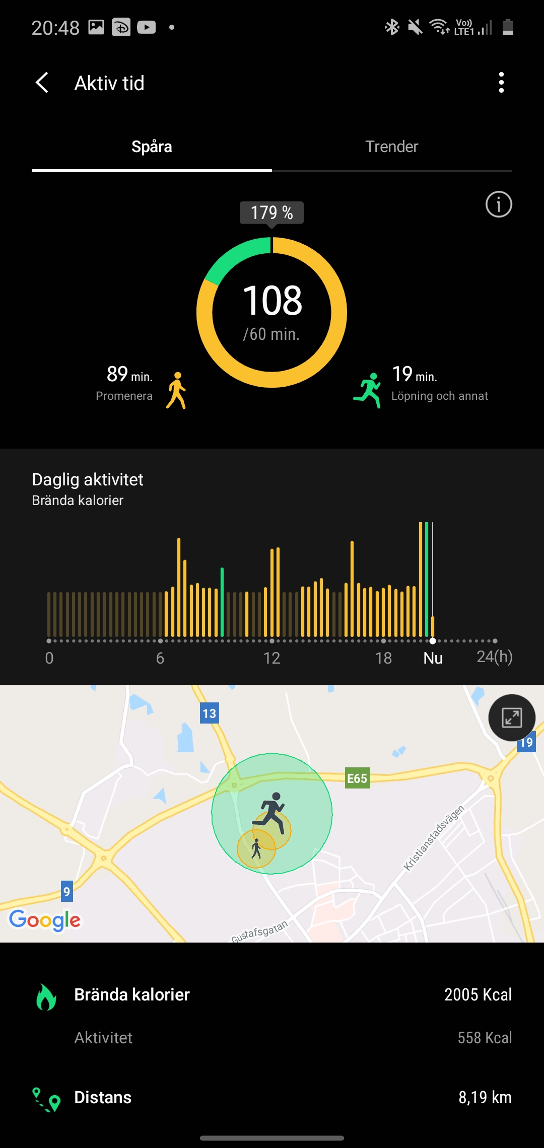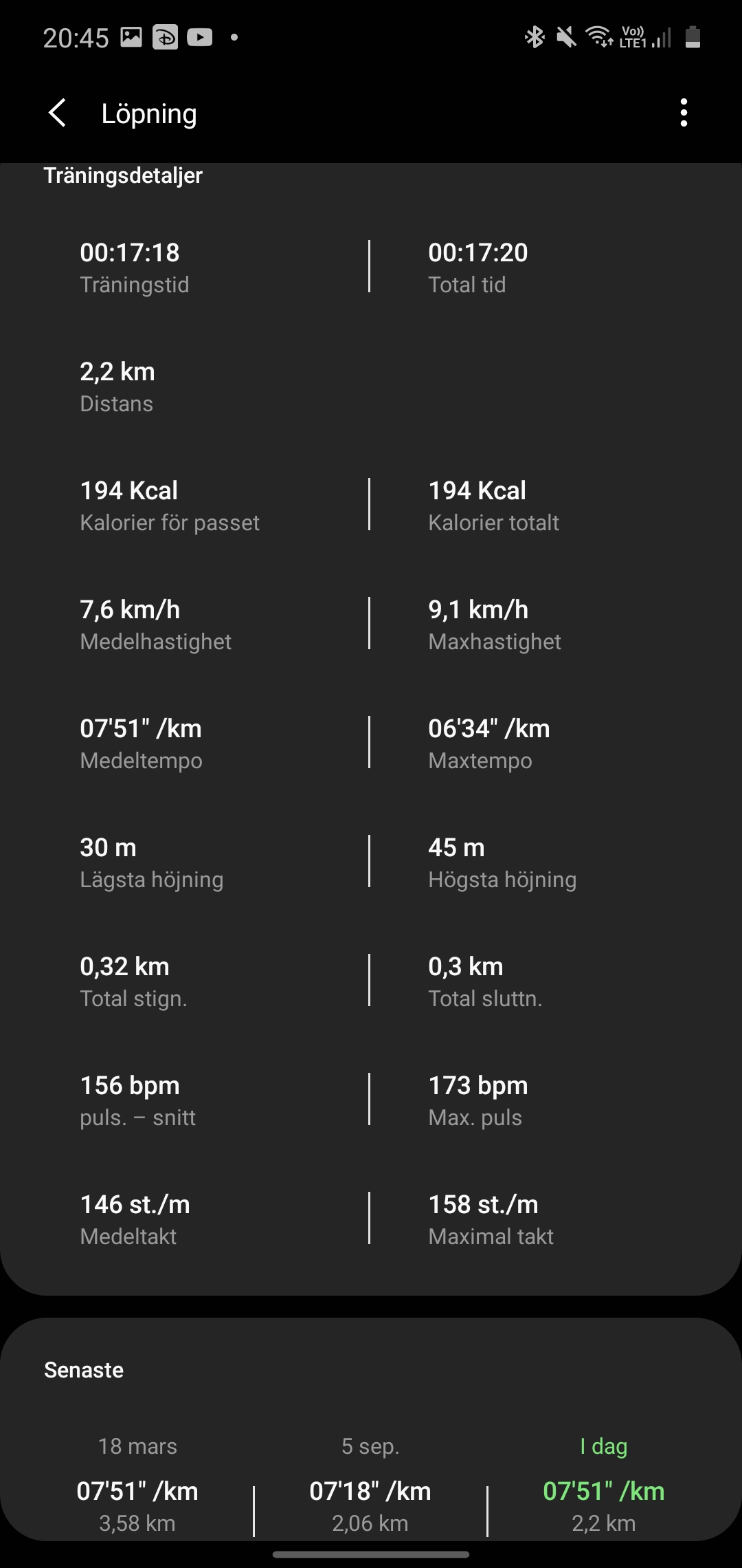 Galaxy Watch 3 utnyttjar sina sensorer för att spåra både konditionsbaserad träning och gym-aktiviteter. För joggaren eller cyklisten innebär det att klockans GPS spårar rutt och avstånd, vilket också bidrar till att mäta hastighet. Med den inbyggda barometern kan klockan också avgöra höjdskillnader, vilket innebär att den kan mäta träningseffekt annorlunda i kuperade miljöer. När vi testar klockans GPS ser vi ojämna resultat. Vid ett test på 2,3 kilometer visar klockan ett resultat på 2,2. Vid ett annat test ser vi dock endast en skillnad på 20 meter. GPS-signaler kan hindras av allt från väder till träd och höga hus. Samtidigt brukar vi inte se sådana felmätningar under våra GPS-tester.