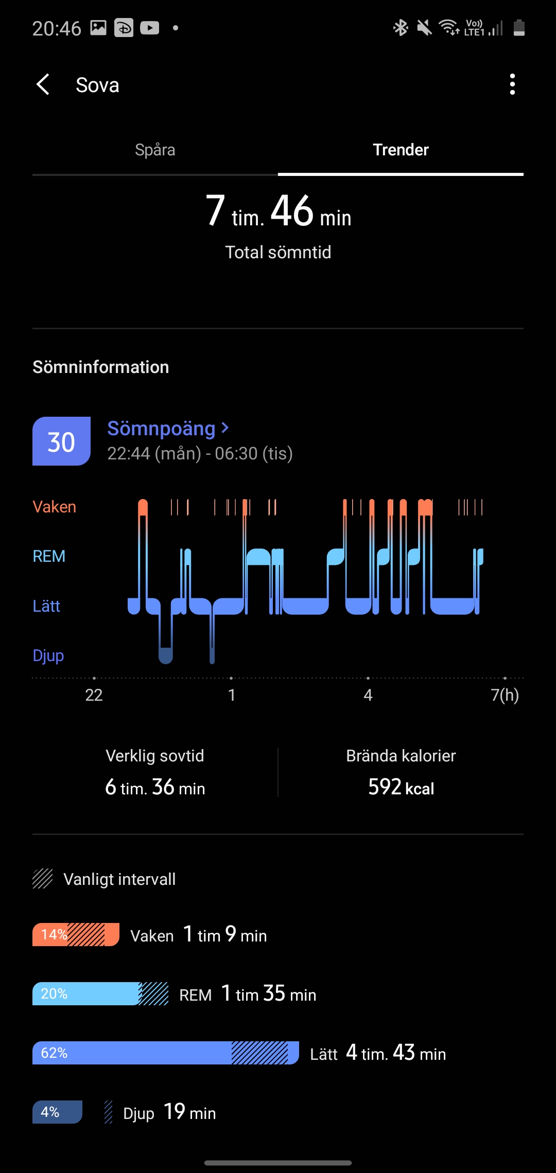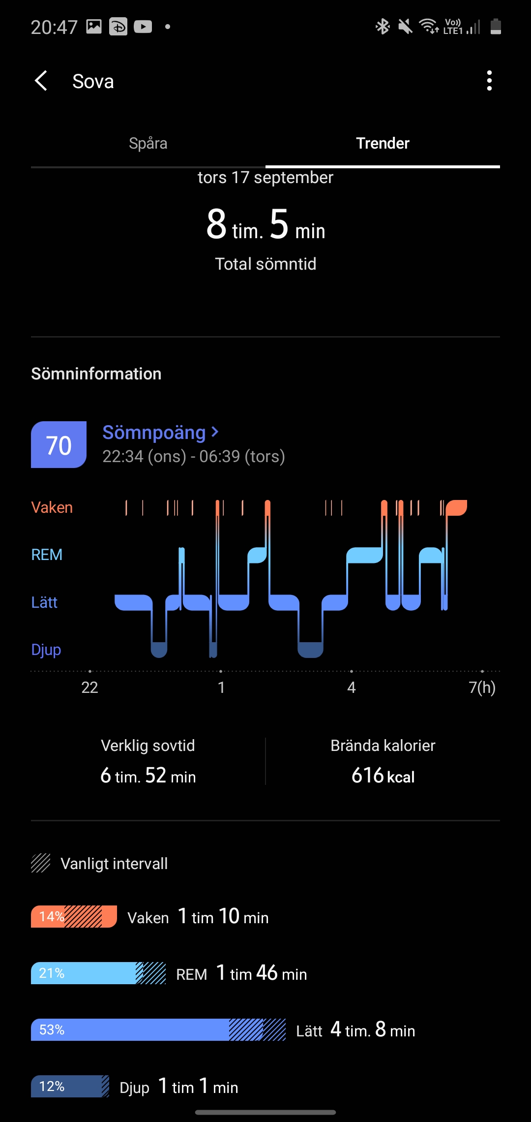 Samsung har inte lyckats få bukt på sin sömnmätning med Galaxy Watch 3. Vi ser i alla fall inte längre att klockan mäter sömn när vi tittar på TV, vilket är en klar förbättring. Samsung presenterar de tre sömnstadierna lätt- djup- och REM-sömn och försöker identifiera när vi vaknar under nattens gång. Dessa värden är svåra att validera men vi reagerar på att klockan ofta mäter väldigt lite djupsömn, till och med så lågt som noll procent och omkring fyra. Tiden då klockan anser att vi är vakna mäts ofta till över en timme per natt och Samsung Health förklarar att dessa består av både medvetna och omedvetna uppvaknanden. Varje natt tilldelas ett så kallat Sömnpoäng som på grund av de olika mätningarna ofta hamnar ovanligt lågt under vårt test.
