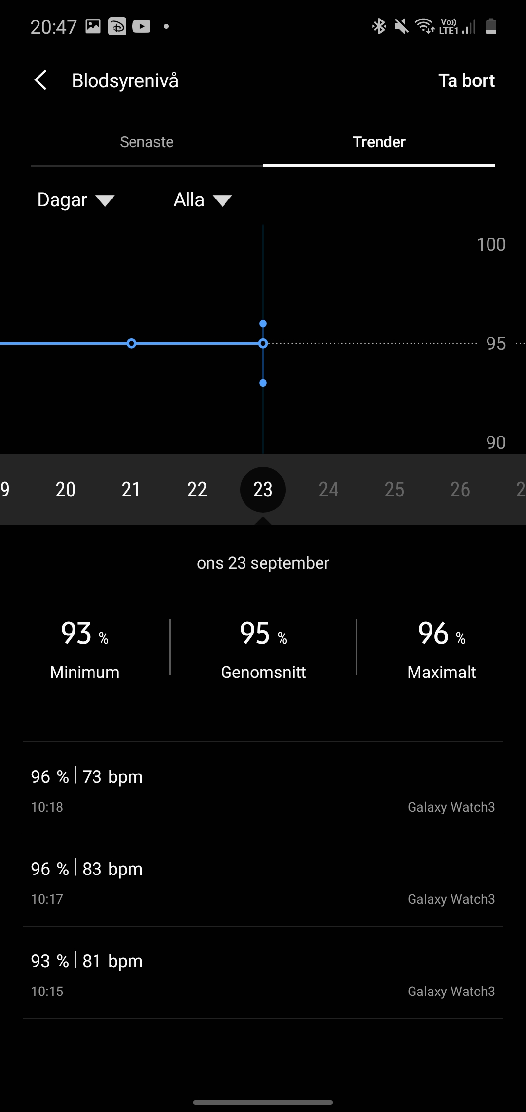 För att vara en stilig smartklocka erbjuder Galaxy Watch 3 som sagt mycket för den fitness-intresserade. Klockans optiska läsare mäter inte bara pulsvärden utan också blodsyresnivåer, eller SPo2-värden. Med hjälp av pulsmätningar kan klockan också mäta ett så kallat stressvärde, men inte om vi inte ändrar i inställningarna. Från fabrik mäter klockan endast puls var tionde minut och då kan den inte avgöra om användaren är stressad eller inte. Att endast mäta var tionde minut innebär också att en ofullständig mätning inte kompenseras före nästa intervall och det är lätt att den tappar viktig data. Ställer vi om till kontinuerlig insamling, ser vi betydligt fler mätningar och då även ett stressvärde.