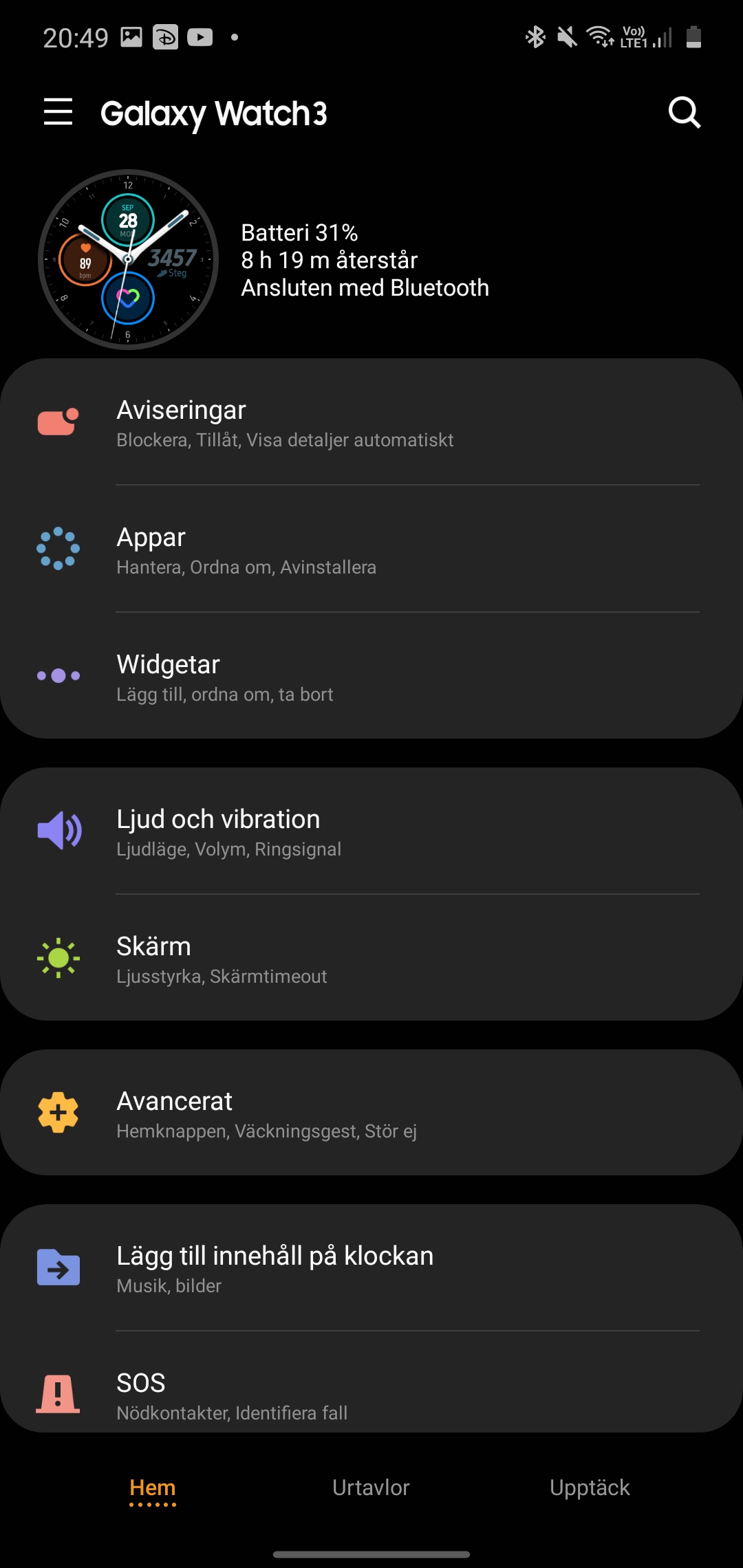 Möjligheten att koppla upp Galaxy Watch 3 till 4G-nätet med eSIM förlänger räckvidden mellan telefon och smartklocka bortom begränsningen av Bluetooth och Wi-Fi. Klockan erbjuder alltså full självständighet men med en liten hake, majoriteten av notiserna vi kan ta emot kräver att telefonen är påslagen och har en uppkoppling. Här har det inte hänt mycket sedan år 2018.